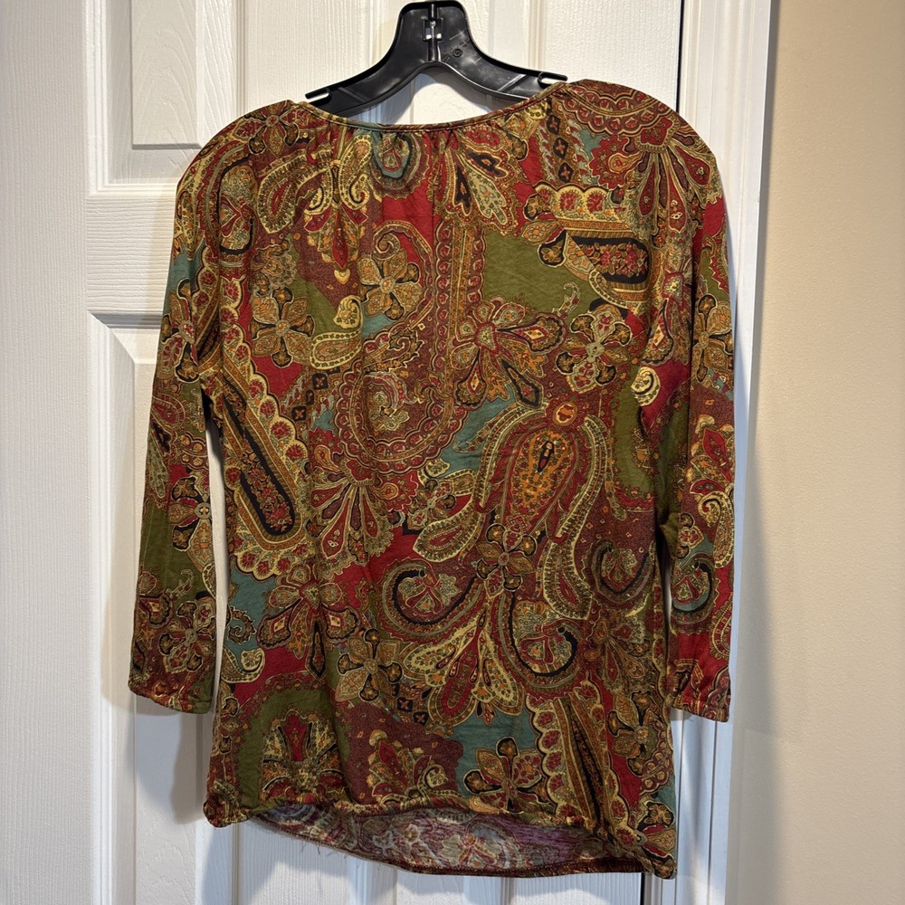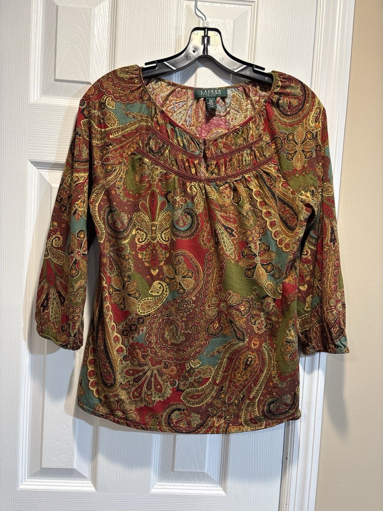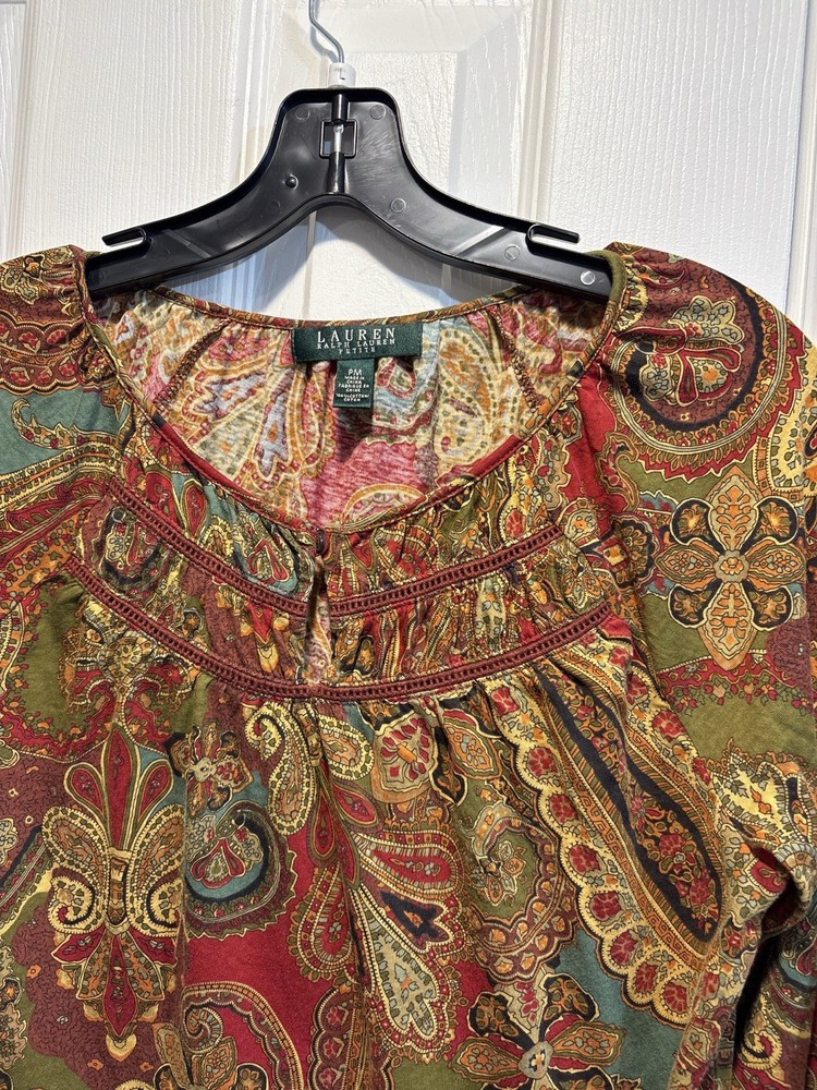 Lauren Ralph Lauren petite paisley peasant blouse featuring a rich multicolor boho print. Designed with a gathered yoke neckline and 3/4 sleeves with elastic cuffs for a relaxed, flattering fit. Lightweight and perfect for fall layering or casual boho styling.