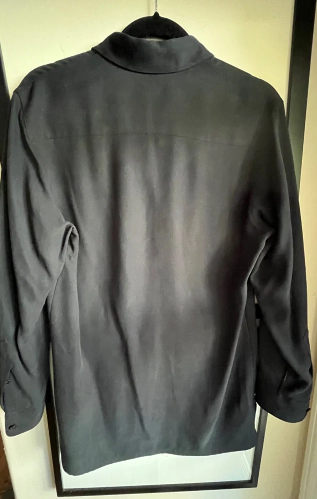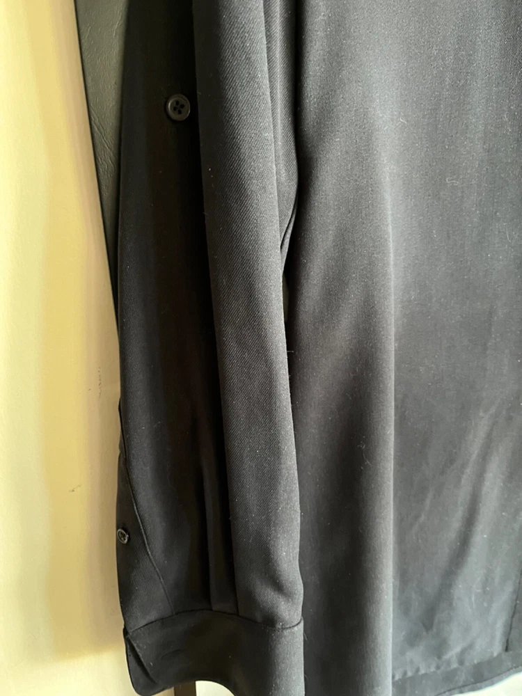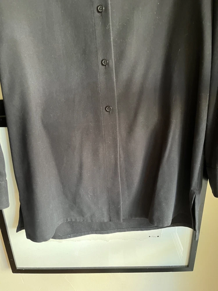 Lauren Ralph Lauren black somewhat heavy silk blouse marked small. Two way sleeves, one with roll tab. Collared and longer than most. Measures over 30 long and upper back shoulder to shoulder seams about 17. Sleeves when down 23. Across the chest when buttoned and flat almost 20 and the same across the bottom in front from 4 inch side splits. No pockets and appears very gently enjoyed.