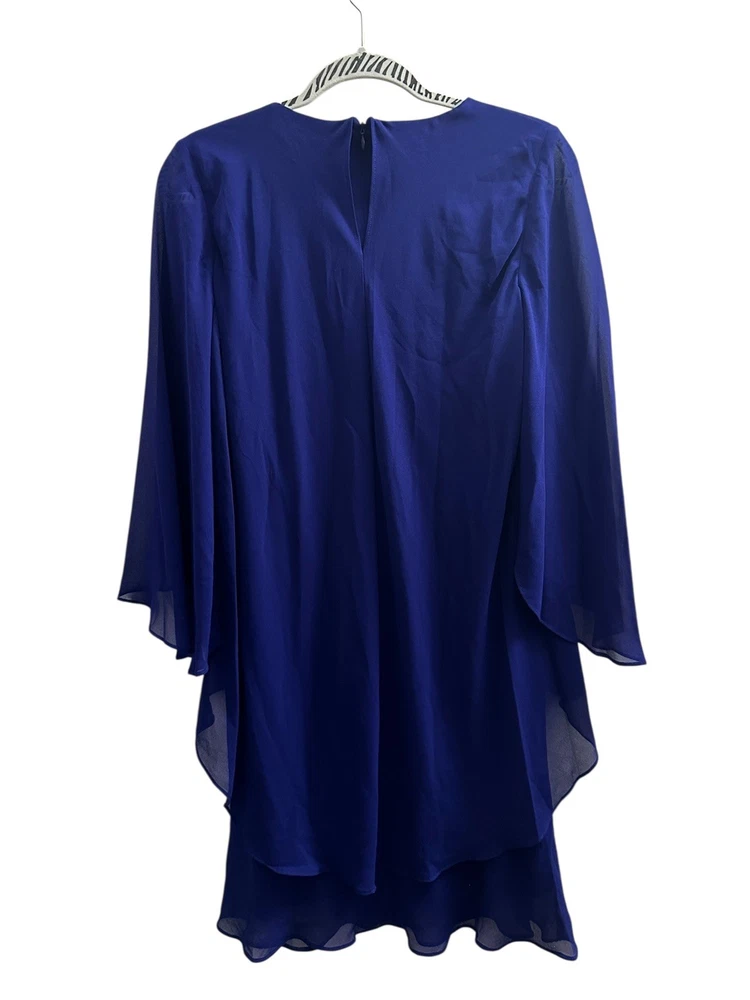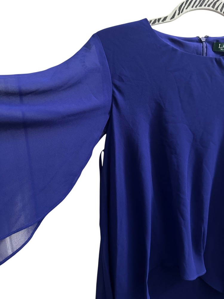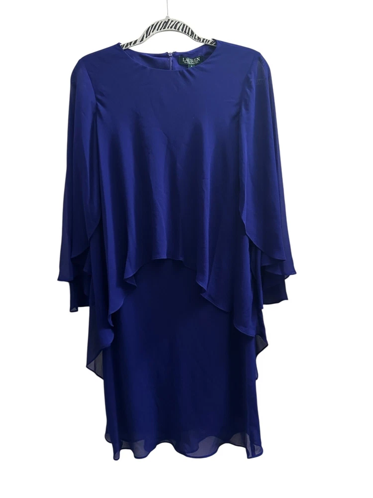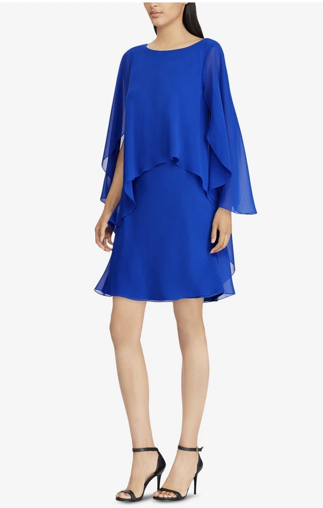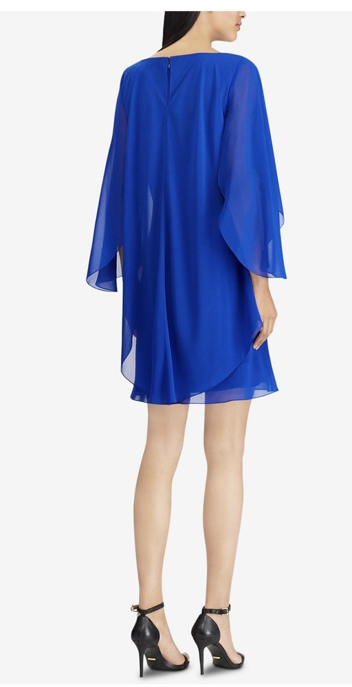 Airy chiffon and a sweeping asymmetrical cape define the elegant femininity of this petite cocktail dress from Lauren Ralph Lauren. • Shift silhouette • Intended to hit at the knee • Rounded neckline • Sheer 3/4-sleeves • Asymmetrical cape overlay • Fully lined • Shell and lining: polyester • Dry clean • Imported