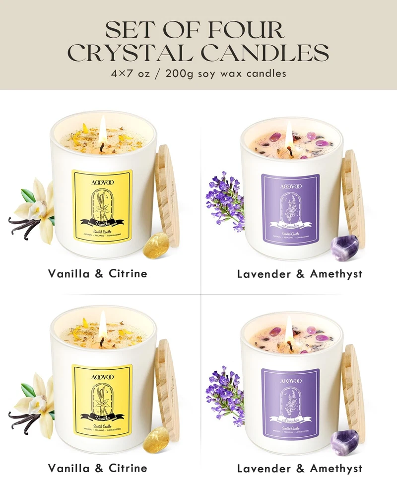 HIGHLY SCENTED LAVENDER CANDLES SET: Introducing our 4-piece highly scented candle Christmas gift set, one of the joys of candle sets is the art of curating the perfect collection, Indulge in the sweet Vanilla, the calming Lavender found in our candles. Scented candles gift sets offer a delightful journey of discovery for the senses SCENTED CANDLES GIFT Set for WOMEN and MEN: The fragrance is prepared by our professional perfumer, and the exquisite packaging box is designed according to the brand, floral fragrance as inspiration, We are confident in the professional craftsmanship of the aromatherapy candles. The scented candles are perfect for Christmas gift, Valentine's Day gift, mothers day gifts for mom, Thanksgiving Day gift, anniversary gift, and Birthdays gifts for women, mom mothers, girlfriends and wife NON-TOXIC, CLEAN, & LONG-LASTING BURNING: Each aromatherapy candle for women is made with pure soy wax and features a lead-free cotton wick. This candles contains pure essential oils and fragrances that work to fill the air with natural goodness and delightful scents. The 7oz soy wax candles burn cleanly, purifying the air in your home for at least 40 hours, 4 Pack scented candles gift set can burn 160 hours delivering a refreshing and long-lasting burn CANDLES WITH CRYSTALS INSIDE & DRY FLOWERS: Our Crystal soy candles is adorned with dried flowers and features natural energy crystals that radiate positive vibes. This scented candles is perfect for meditation, helping to relax, soothe, restore, and balance your body and mind. When the candle burns, it doesn’t just bring fragrance; it combines the nurturing energy of crystals, believed to soothe and calm your emotions, with the rich, natural aroma of the candles Candles: Provide the world with top-quality candles at half the price. Every step of our candle production is independently handled by , as we are dedicated to creating high-quality candles, allowing people worldwide to enjoy a premium lifestyle affordably. Our scented candles are crafted by professional perfumers, ensuring a delightful fragrance experience. If you have any questions, feel free to reach out. We're committed to ensuring your satisfaction