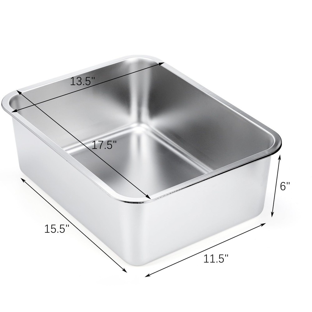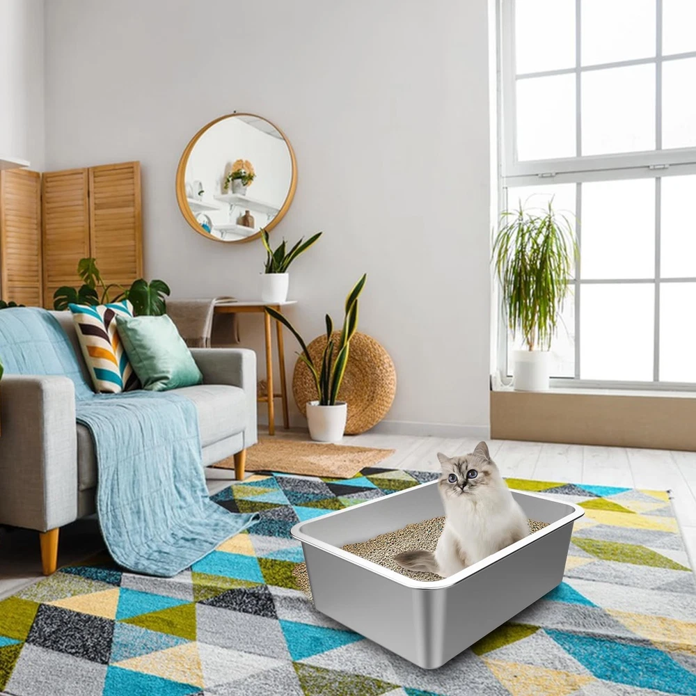 Lawei 2PCS Stainless Steel Cat Litter Box, Medium Metal Medium, Silver Product Details Package Includes: You will receive 2 pack stainless steel cat litter boxes, each metal cat box measures approx. 17.5 x 13.5 x 6 inches, which are applied to cats, kittens, rabbits, ferrets, hamsters, hedgehog and other small pets; You can easily take care of multiple kittens in the house by these litter boxes. Premium Thickened Material: Lawei metal cat boxes are made of high-quality stainless steel, which is rust resistant and super durable, not easy to deformation and break, bending, concave and convex. These litter boxes are extremely sturdy for active cats or rabbits, and can be applied for a long time. Raised Side Design: This metal kitty litter pan with high sides design caters to your cat's natural habit of frequent entry and exit, which effectively prevents small pets from taking out garbage and urine when they jump out, and keeps the home tidy. This design also prevents your cat from being scratched; It is providing full security for you and your cat. Easy to Use: The large stainless steel litter tray has smooth arcs around the edges and corners to protect your pet's safety and hygiene, while the dual side handles make it easy to move the metal litter tray steadily. Non-slip while protecting the floor from scratches. For cats who like to sharpen their claws, the smooth surface will not attract their attention. Easy to Clean: Our metal litter box for cat have non stick and smooth surfaces, which make cleaning quick and easy with any shovel; You can easily clean the litter box by hand under warm or flowing water and wipe it dry with a cloth.