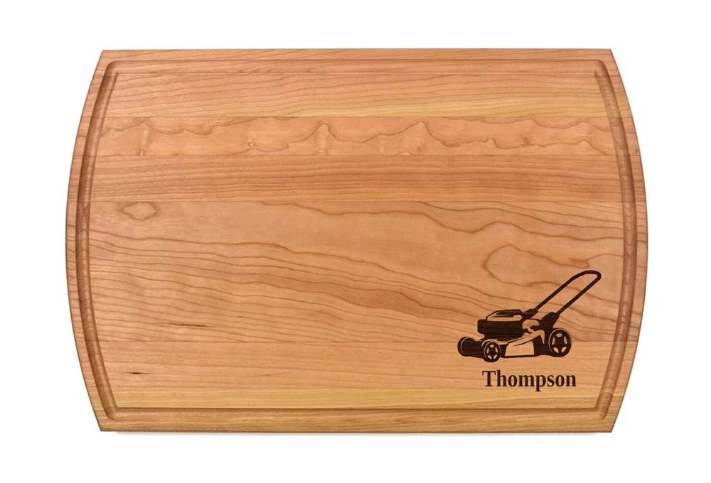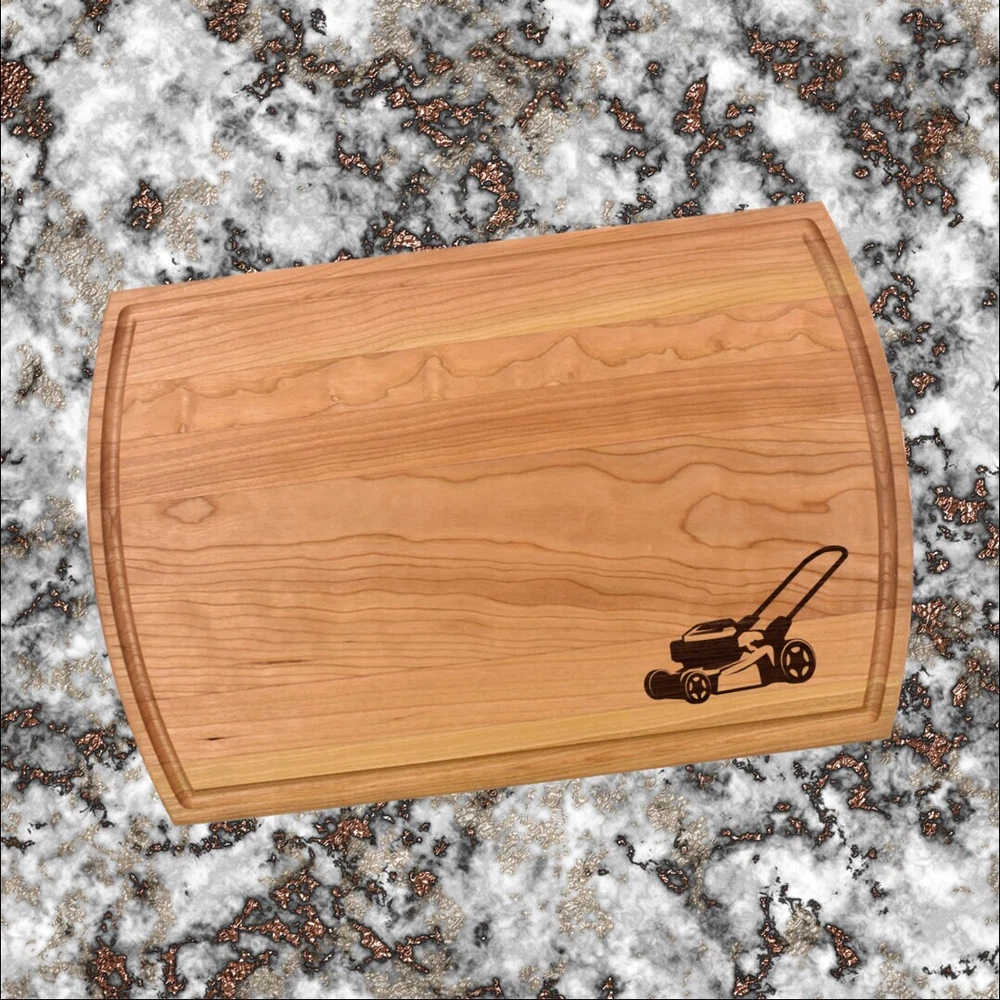 Design: Personalized Lawnmower Cutting Board or Charcuterie Serving Tray All items ship via USPS - please make sure your address is correct :-) Whether used as a charcuterie serving tray for snacks or cutting board, our bamboo, walnut and cherry custom boards are the perfect addition for the home and make the perfect gift for your loved one celebrating a birthday, anniversary, new home, wedding, etc! *** FEATURES *** • SIZES: We have multiple styles and sizes available. To see our current sizes available, click the drop-down menu. The photo slide contains a photo showing each side by side. Please note, the board with the juice groove only has the groove on the front side of the board. • THICKNESS: Bamboo Boards - Approximately 1/2" Thick; Walnut & Cherry Boards - Approximately 3/4” Thick • UNIQUE: Every board is unique with the grain and coloring varying throughout - no board is the same! • CARE INSTRUCTIONS: Hand wash only with warm water. Do not soak. Please apply mineral oil throughout the board’s life. • PERSONALIZATION/CUSTIMIZATION: Do you want the text placed differently on the board? Please don’t hesitate to contact us. All personalization notes can be entered in the personalization box when checking out. • SHIPPING: All cutting boards ship within 2 to 5 business days. • WHOLESALE ORDERS: Please don’t hesitate to contact us for information about wholesale orders. Processing times for larger orders may change. • NOTE: Colors can vary a bit on different monitors and screens. Any props included in photos are not included. Please be sure to double-check your address to make sure it is accurate for USPS delivery. If a package is returned to us due to an invalid address, the buyer is responsible for all additional shipping charges. We appreciate you supporting small business – best wishes! For items ordered with simple edits, we do not send proofs since the layout doesn't change from the example(s). However, in the event there are requests that change the layout from the example(s), we do send proofs for approval before making the product. If you'd like a proof before we make the product, please note so in the personalization box.
