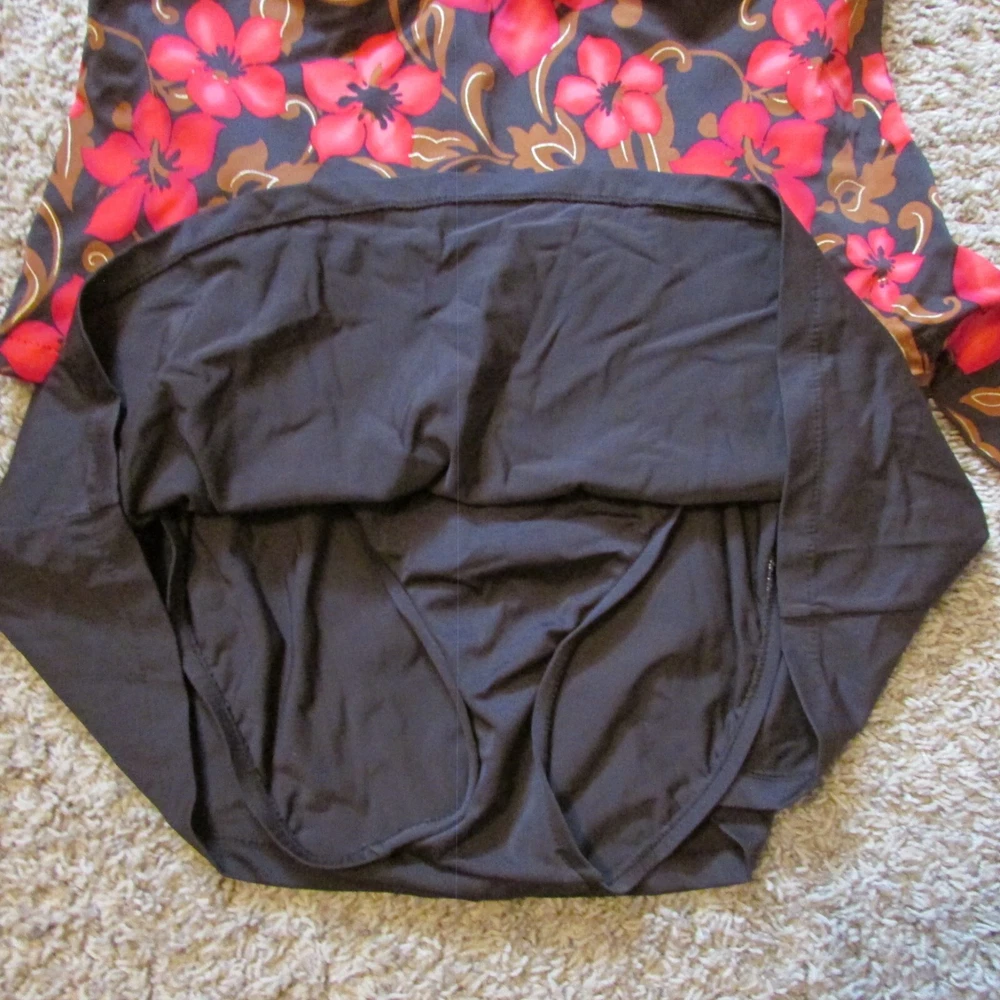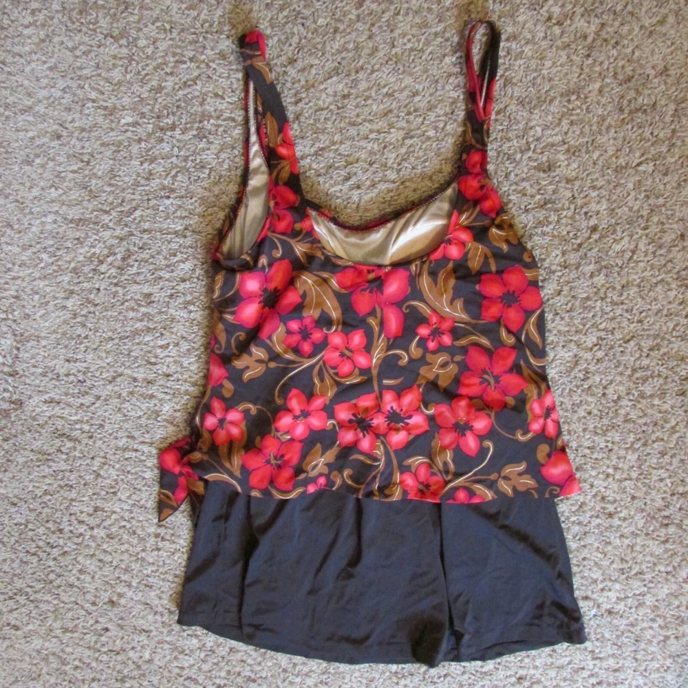 Le Cove 16 Red Brown Floral One Piece Swimsuit Swim Skirt Pad Bra Shelf EUC gold metallic for a little shimmer ties at the side leg opening: 26" 31" from shoulder strap seam to bottom of skirt pit to pit: 18.5" smoke free home I am highly noted for super quick shipping Feedback My goal is 100% Customer Satisfaction I strive for nothing less than a Positive Feedback with a 5 Star across the board rating. If you have any questions or problems with your sale, please notify me before you post any negative feedbacks. Give me a chance to resolve the situation... Thank You