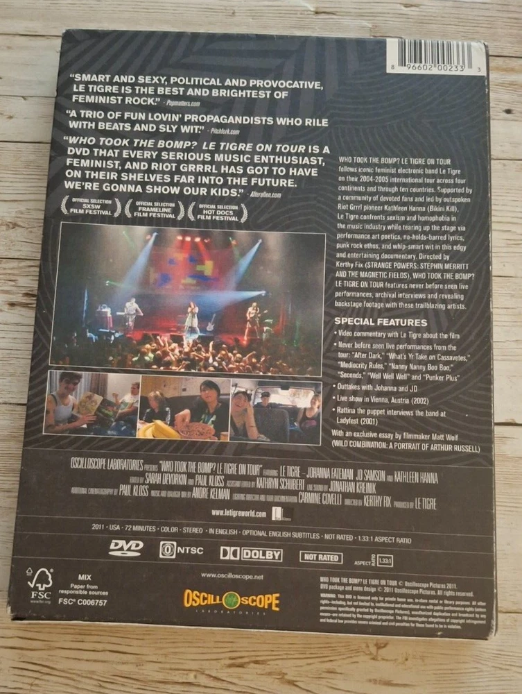Run Time:72 min.gtin13:0896602002333Genre:RockSub-Genre:Music Video (Concert/Performance)Movie/TV Title:Who Took the Bomp: Le Tigre on TourUPC:0896602002333Type:Live MusicSeller Notes:“In Very Good Preowned Condition.”Rating:NRStudio:OscilloscopeRelease Year:2011Format:DVD