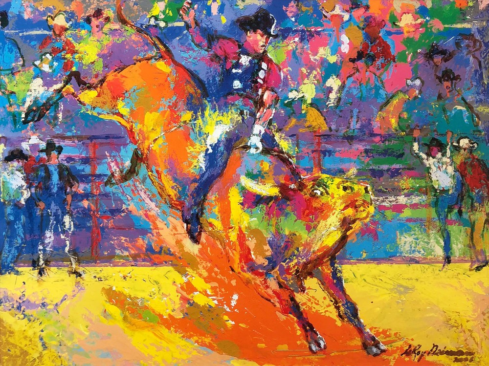LeRoy Neimans - "Bull Rider-Adriano" This is the Image used for the Tickets and program covers at the US Open at Bethpage Black in 2000 This Artwork is: OUT OF PRINT An Offset Lithograph printed on Neiman's usual high quality paper Plate Signed Newly Custom Framed in a TOP QUALITY Bronze colored Wood Frame DOUBLE Matted in: Blue/White The Framed Piece Measures Approx. 33" x 28" Image size is Approx. 19" x 25" THE FRAMING IS AMAZING ***FRAMING ALONE is worth over $400 *** Framing can be changed for a nominal fee. FRAMING ALONE IS WORTH OVER $150! LeRoy Neiman (1927-2012) America’s Most Popular Sports Artist, a chronicler of contemporary lifestyles, and a master of the action-subject. His works are held in the Baseball Hall of Fame, Football hall of Fame, The Art Institute of Chicago, The Portland Museum of Art, & The Hermitage Museum (Leningrad). His technique often started with his own impressionistic style and continues with a process style that looks very similar to the action paintings of the abstract expressionists.