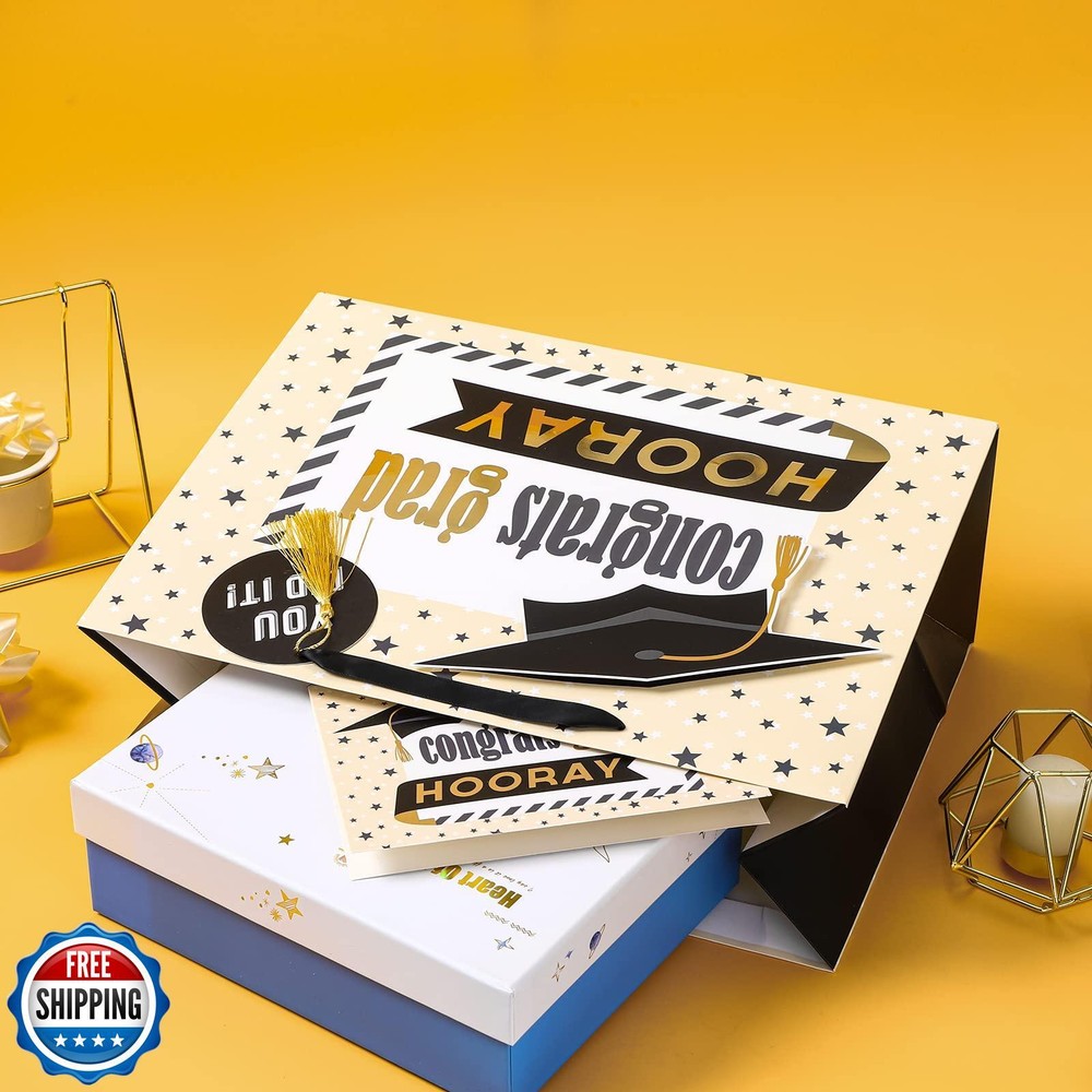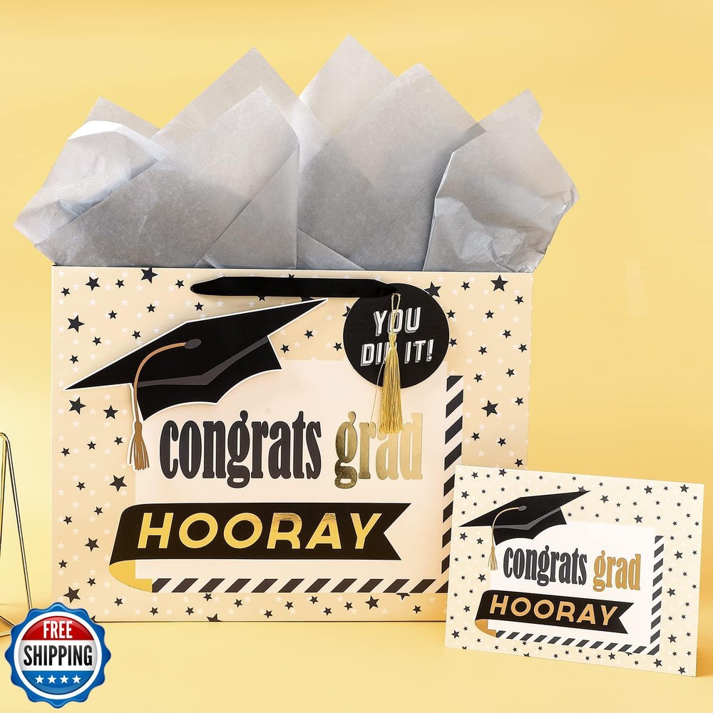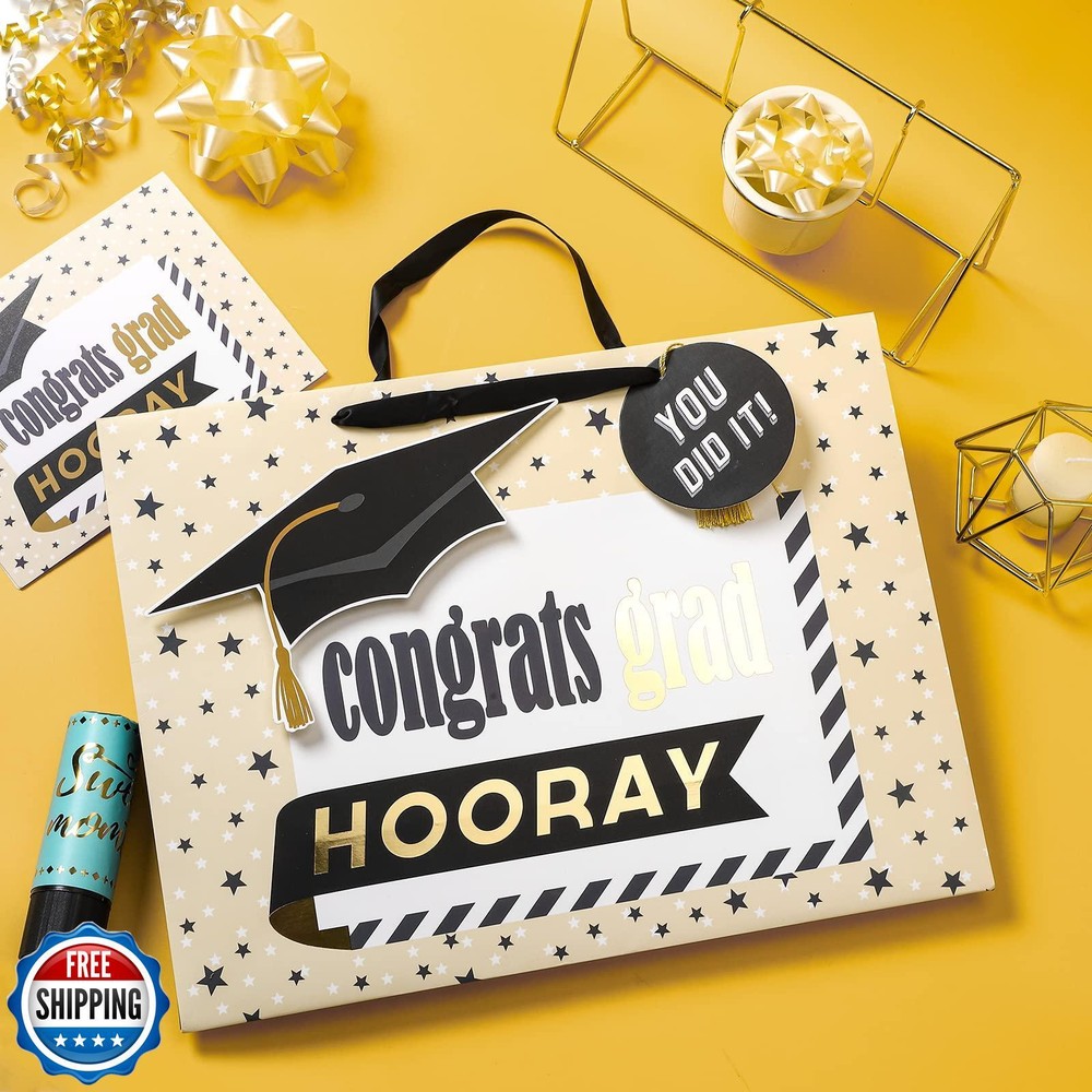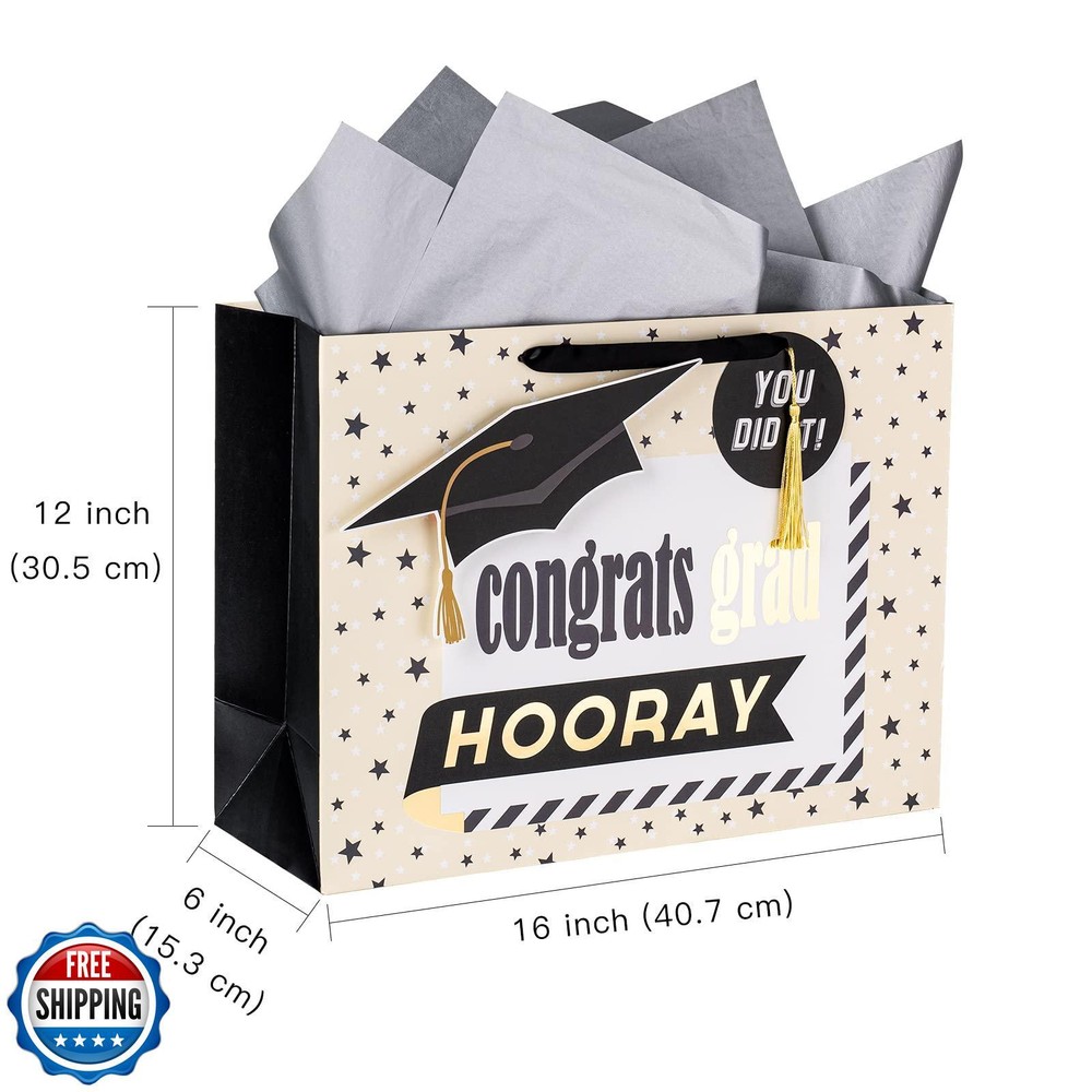 LeZakaa 16" Graduation Gift Bags with Tissue Paper, YOU DID IT Gift Tag and Card, Trencher Cap and Stars, Congrats Grad Design for Graduation Party, Ceremony, Special Occasions, Large Size Features GRADUATION DESIGN: This gift bag features a festive and elegant design perfect for any graduation celebration. The front showcases a prominent black graduation cap with a gold tassel, accompanied by celebratory phrases like "YOU DID IT!" and "Congrats Grad." The background is a soft beige color with scattered stars, adding a cheerful and celebratory touch. The bold, modern fonts and vibrant accents in black and gold make this gift bag an eye-catching choice for presenting gifts to a graduate. SIZE: This extra large gift bag measures approximately 16" (40.7 cm) wide by 12" (30.5 cm) high by 6"(15.3 cm) deep. The greeting card measures approximately 5.9 inches (15cm) by 7.9 inches (20 cm). Perfect for holding candles, figurines, books, jewelry, DVDs, puzzles, toys or clothing. SUPER CONVENIENT: Purchase includes 1 gift bag, each bag comes with 1 sheet of tissue paper, 1 gift tag, 1 greeting card, to make wrapping gifts quick and easy. It is perfect for presenting a coordinated set of gifts or giving matching presents to a graduate. IDEAL FOR GRADUATES OF ALL AGES: This gift bag is perfect for anyone celebrating a graduation, whether from high school, college, or any other educational milestone. The design is versatile, appealing to both young graduates and those celebrating later in life. It’s a great option for parents, friends, and family members looking to wrap up their thoughtful gifts in style. Ideal for graduation parties, ceremonies, or as a special way to present a gift to a recent graduate. ECO FRIENDLY: Our gift bags made of eco friendly and reusable cardboard, use for a fast and simple alternative to standard gift wrapping, easy grab and go! Shipping Free & Fast Shipping: We offer free shipping to most of the USA with a normal delivery time of 3-7 days. However, due to the current situation, additional delivery time (up to 3 weeks) may be required for some items. Alternative Carriers: We may use alternative carriers (e.g., USPS, FedEx, UPS) to ensure your package arrives safely and on time. Due to the use of multiple carriers, we are unable to provide a tracking number automatically. Handling Time: Orders are processed and shipped within 1-2 business days of receiving cleared payment. Shipping Restrictions: Shipping to Alaska, Hawaii, Puerto Rico, Guam, and other US territories may incur shipping charges or delivery restrictions. Please contact us before ordering, or your order can be refunded/cancelled. State Restrictions: Certain items may not be shipped to California due to state regulations. Contact for Tracking Updates: If you require tracking updates or have any concerns about the delivery of your order, please feel free to contact us, and we will be happy to assist you. Return Policy 30-Day Hassle-Free Returns: If you are not completely satisfied with your purchase, you can return the item for free within 30 days of receiving it for a full refund or exchange. Easy Return Process: Contact us, and we will provide you with a prepaid return shipping label and detailed instructions. No Restocking Fee: There are no restocking fees for returns. However, the buyer is responsible for return shipping costs if the return is not due to a seller"s error. Refund Processing: Refunds will be processed within 1 business day of receiving the returned item in its original condition. Feedback Your feedback is extremely important to us. We strive to provide the best products and customer service possible. If you are satisfied with your purchase, please take a moment to leave us a positive review. If you have any concerns or issues with your order, please contact us before leaving negative feedback. We are committed to resolving any problems and ensuring your satisfaction. Contact Us If you have any questions or concerns, please feel free to reach out to our customer support team. You can contact us through the eBay messaging system. We are available Monday to Friday, 9:00 am to 5:00 pm EST, and we will do our best to respond to your inquiry within 24 hours. Thank you for supporting our small family business!