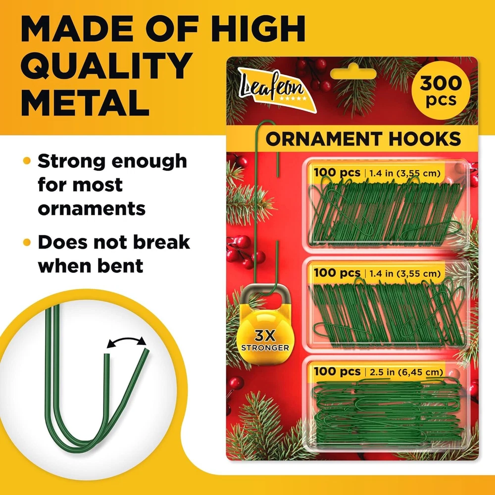 Leafeon 300 Pack Christmas Ornament Hooks for Tree Decoration Green Product Details Mounting Type: Hook Maximum Weight Recommendation: 5E+1 Ounces Number of Hooks: 300 Number of Pieces: 300 Recommended Uses For Product: Decoration Manufacturer: Leafeon Product Dimensions: 12.6 x 4.13 x 0.53 inches Item Weight: 2.47 ounces Country of Origin: China Item model number: OH3000 Finish types: Painted Batteries required: No Included Components: 300 Green Metal Ornament Hooks (200 pcs ¼” hooks, 100 ½” hooks) Color: Green Material: Metal Brand: Leafeon Item Weight: 70 Grams Item dimensions L x W x H: 12.6 x 4.13 x 0.53 inches INCLUDES: 300 Green Metal Ornament Hooks is a great amount for any Christmas decoration process - 2 Sizes Included: 200 pcs ¼” hooks, 100 pcs ½” hooks - Use for both small and large ornaments. VERSATILE: Our green ornament hooks are perfect for hanging Christmas ornaments, tree ornaments, Christmas decorations, easy for hanging or taking down the decorations off Christmas trees. EXTRA STRONG: Made of strong iron, sturdy enough to hold up to 50 ounces. Our ornament hangers are durable for any Christmas decoration. REUSABLE: You can use our Christmas ornament hooks over and over again. Add Christmas hooks to all your special hand-made ornaments or any Christmas ornaments for an extra festive look. They are ideal Christmas ornament hooks for crafting.