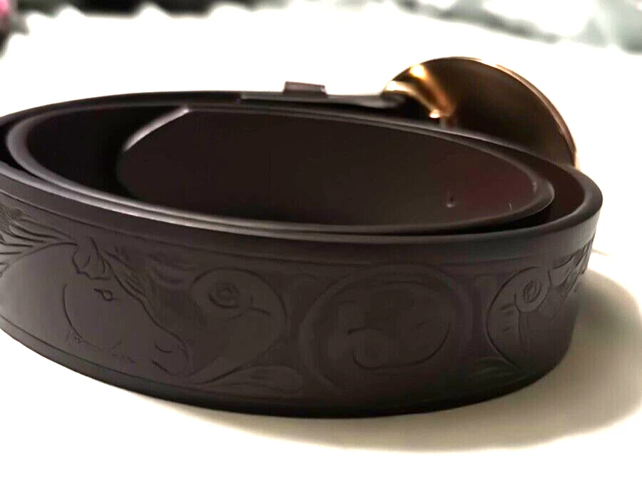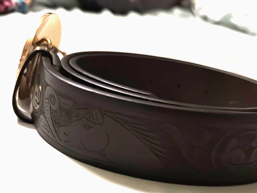 A Western-style unisex leather belt in brown, size 34, featuring a scorpion buckle with horse stamped embellishments and a flower themed buckle design, featuring a real scorpion encased in resin. This belt is perfect for those interested in a cowboy or western-inspired look.