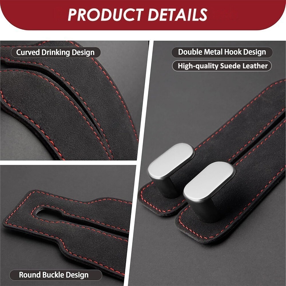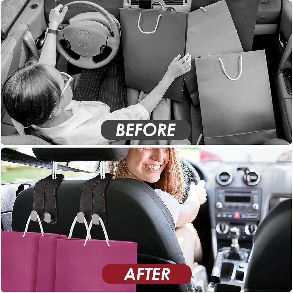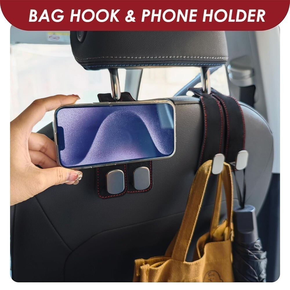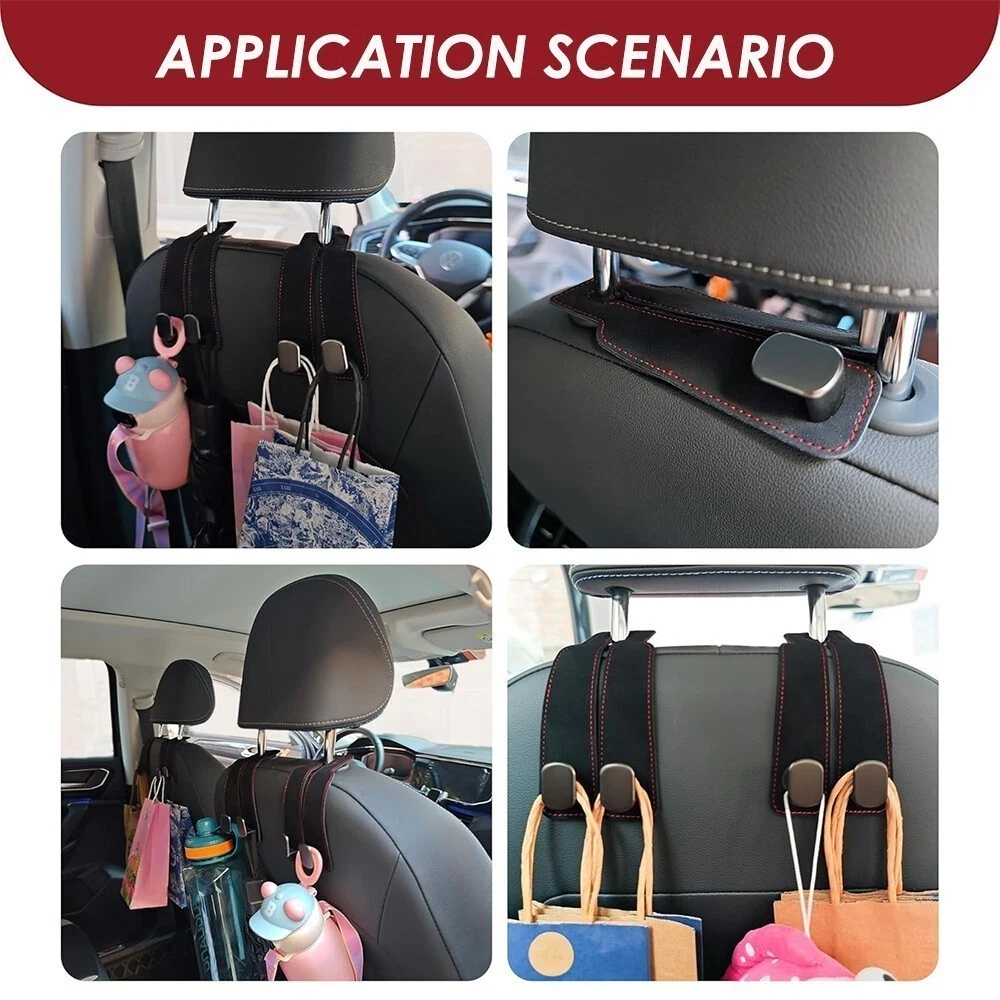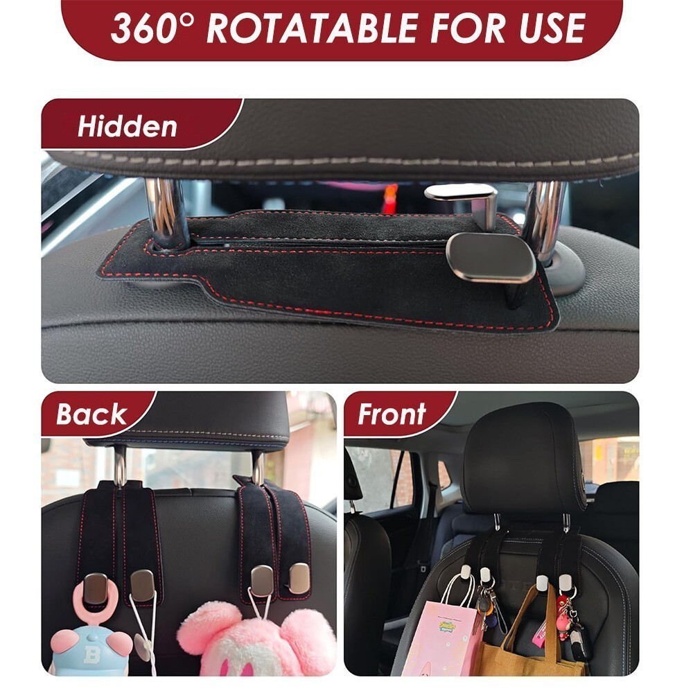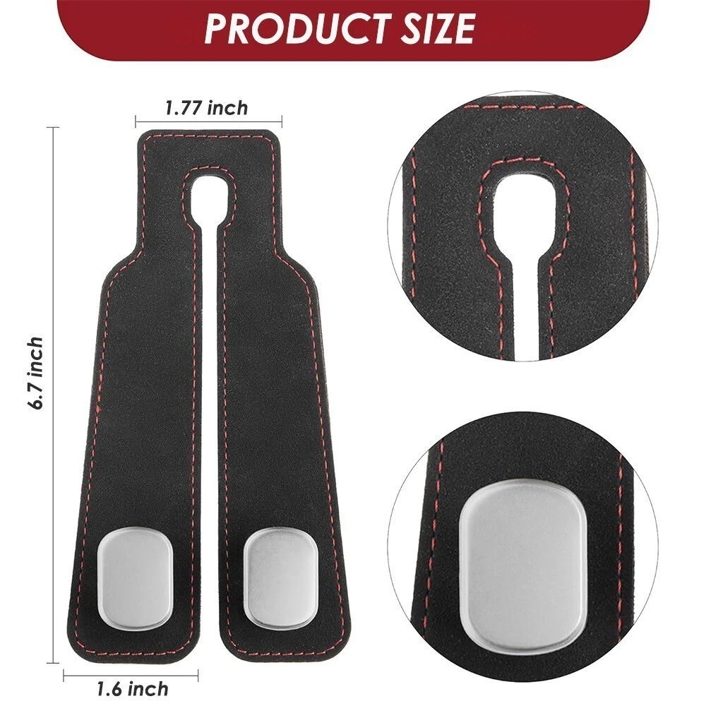 Product Details Product Description: Utility Car Purse Hook: The 2-in-1 purse hook for car is designed with a double hook, car seat hooks for headrest can not only hang a lot of things, but also make a stable phone stand to keep your interior clean. And their 360-degree rotation function can be used in any direction. Flexible and Space-Saving: The car purse hook doubles the storage space of the car headrest, allowing you to hang more items. When not in use, car seat back storage hooks can be hidden under the headrest rod to save space and ensure compatibility with your car. Premium Leather Body: The body of the purse hook for car is made of high-quality suede leather with alloy, high toughness, wear and durable, and the stitching is matched with fashion, car seat hooks for headrest can perfectly adapt to any shape of the seat and provide a stylish and elegant look. Car Hooks for Headrest: These purse hooks for car are made of high-density metal that can weigh up to 44 pounds and are not easily broken, making it very suitable for hanging sundries, clothes, umbrellas, handbags, wallets, mobile phones, etc. Easy Installation: Car seat back storage hooks do not need to remove the headrest or use any tools, just install them directly, providing flexible storage options for most cars, SUVs, and trucks. Package Included: 1 x Car Seat Hooks for Headrest