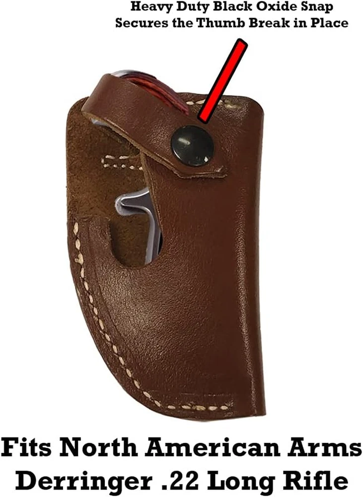 Be prepared for anything with our new Leather Derringer Belt Slide Holster! This holster is made with genuine leather and easily slides onto your belt, perfectly holding and concealing your Derringer until you need to draw it! The genuine leather accommodates the North American Arms Derringer .22 Long Rifle Revolver. This Derringer .22 LR Revolver OWBholster works perfectly by sliding it on to your belt with the belt slide, and is easy to conceal. A leather thumb break with a Heavy Duty Black Oxide Snap keeps your Derringer in place until you are ready to draw it. Expertly stitched holster ensures long life of your product. The leather is formed to the shape of the Derringer to help hold it in place. Proudly Made in the USA using only the highest quality materials, this holster wont let you down! Keep protection within reach! Note: Holster is made for Right Hand Draw