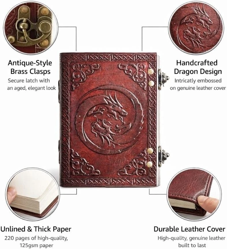 Unleash your creativity with this Leather Dragon Diary Notebook – 5x7" Brown Vintage Journal (Buy 1 Get 1 Free Combo) . Handcrafted from premium genuine leather, this unique notebook features an eye-catching embossed dragon design that symbolizes strength and imagination. The compact 5x7" size makes it perfect for daily journaling, sketching, travel notes, or personal reflections. Inside, you’ll find 220 unlined pages that give you complete freedom to write, draw, or doodle without restrictions. With its rustic vintage finish and durable binding, this leather diary is designed to age beautifully over time. Whether for personal use or as a thoughtful gift, this B1G1 combo offers exceptional value and timeless style. Key Features ✨ Buy 1 Get 1 Free Combo – Great value pack 🐉 Embossed Dragon Design – Bold & artistic vintage look 📖 220 Unlined Pages – Ideal for writing, sketching & notes 📏 Convenient 5x7" Size – Portable & travel-friendly 🧵 Handcrafted Genuine Leather – Premium quality & durability 🎁 Perfect Gift Choice – Suitable for students, writers & artists ⏳ Vintage Rustic Finish – Ages beautifully with use