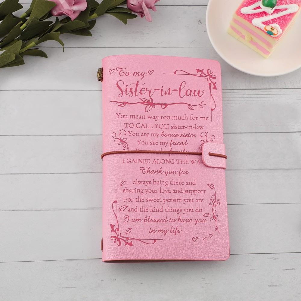 Leather Journal Notebook Gift Using journal notebook to express your love for your loved ones! High-quality leather makes our leather diary more durable. Fine paper:The paper will not scratch or penetrate. The right size:Convenient to carry around can be also used as a wallet or handbag. Multifunction:Additional cellphone slot & card slot. Perfect Gift:Great Gifts for Birthday / Anniversary/ Mother's day/ Valentine's Day/ Special occasion, it is an excellent way to record life. Sister In Law Birthday Gifts: An Engraved journal reminds your sister of your love for her, Ideal gift on Anniversary, Birthday, Travel, Reunion, Wedding, Christmas, or any Special Occasion. Perfect Sister Gift: It is proof of love for a sister and a commemorative gift for sister. She will be very moved when she received such a gift and it will undoubtedly catch her heart. So that your sister can think of your love for her at any time and cherish it. Personalized Sister Notebook: The size of the sister notebook is suitable for carrying computer bags, backpacks, handbags, shoulder bags, and large pockets. It is easy to carry and use outdoors, on the way to travel, or in the office. High-Quality Leather Journal: The journal notebook has the right size 7.9 "x 4.7", leather material, retro appearance, smooth touch, 140 pages of refillable paper including mobile slot and card slot. Multifunctional Journal: journal can be used as a diary, planner, travel journal, bullet journal, school journal, business notebook, executive notebook, office notebook, etc. Whether your sister wants to take notes at work, keep a diary, take travel notes, draw or sketch, this journal is a great choice.