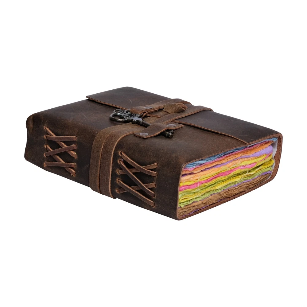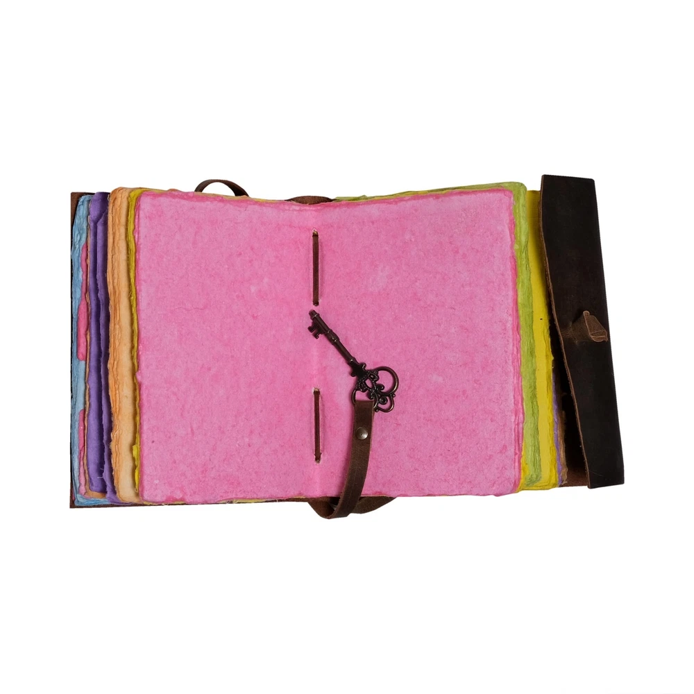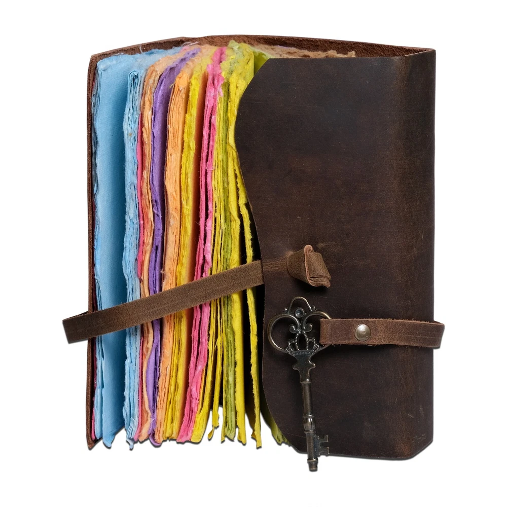 ✔ VINTAGE HANDMADE COLORED PAPER - Rustic Scrapbook Journal is made with 240 pages of Antique Paper which looks like it was pulled from a fantasy. You love the Multicolored antique handmade cotton paper in 7 colors all the colors are mixed and very unique you will love colors which is unique to our journal Notebook. ✔ USE ANY PEN - Sketch, Doodle, Write on your Leather Bound Journal with a Calligraphy Pen Fountain Pen, Brush Pen, Ball Pen, Acrylic Colors, Watercolor, and many more. Paste photos, clippings, recipes, scrap, etc. onto the parchment-style pages. We guarantee no bleed-through. ✔ STURDY BINDING FOR YOUR KEEPSAKE: Strong hand-stitched leather binding keeps the pages securely bound to the genuine leather cover. Pages will never come loose. ✔ THE PERFECT GIFT: You might want to keep the journal to yourself when you put your hands on the soft and supple leather so get two! It's perfect for a personal diary, Wiccan journal, witchcraft supplies, photo album, scrapbook, and junk journal. ✔ ECO-FRIENDLY BY NATURE: A lot of thought went into making sure the journal had a positive environmental effect. So, we decided to use only 240 pages/120 sheets of handmade, hand-torn, non-refillable recycled deckle edge cotton fiber paper that is thick enough to withstand any type of pen. Our paper is acid-free and no trees were harmed in its making.