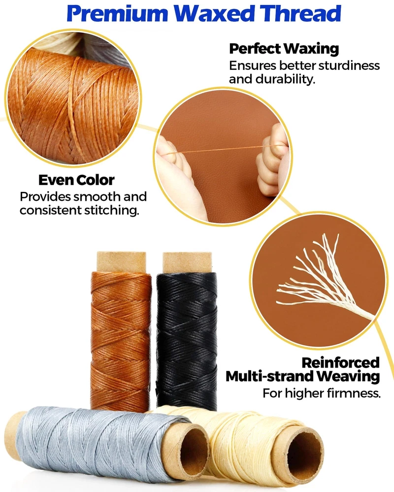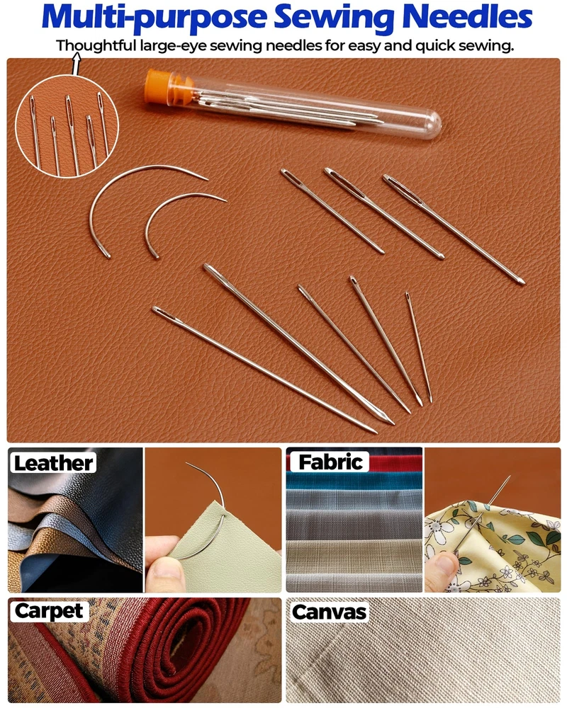 【Complete Leather Sewing Tools Kit】31pcs includes 4 x waxed thread (30m/roll), 7 x heavy duty hand sewing sitching needles, 9 x large eye upholstery sewing needles with 1 x storage bottle (three of each size), 3 x sewing awls, 2 x finger cots, 1 x sewing thimble, 1 x flexible measure tape, 1 x yarn scissors, 1 x zippered storage case. Enjoy easy stitching like a pro tailor with our travel size leather working tools set containing all the sewing essentials just in case. 【Premium Waxed Thread】Well-waxed, evenly colored, multi-strand weaving leather waxed threads with good thickness are not easy to fray, sturdy and durable for long-term use, can smoothly through leather sewing needles and effortlessly pull-through leather with tight, firm, nice and shiny stitches. 【Multi-purpose Hand Sewing Needles】16pcs tough, large-eye needles for sewing and threading with no penetration resistance, such as easy sew job curved needles, glover's needles, sail needles, sack needles, upholstery needles, large-eye blunt point needles, triangle leather stitching needles, etc. 【3 Multifunctional Sewing Awls】Made of ergonomic wooden handles with comfy grip and rigid stainless steel sharp points that will not break or deform, long-lasting. Scratch awl for fast hole enlargement, can wear 1-9mm holes. Hook awl for convenient hooking and sewing. Hollow awl for handy threading from the center. Perfect sewing awl combination for punching, screwing holes, scribing, and perforating. 【Portable Sewing Kit】Waterproof hard-shell zipper case features highly elastic band and dense grids for increased storage space and improved on-the-go carrying security of all your sewing accessories. Sharp yarn scissors, hassle-free threader, practical thimble, protective finger cots and quick measuring tape make your leather craft twice as much with half the work. 【Wide Application】Reliable leather repair kit for car seats, boat, sofa, carpet, furniture, covers, tarps, tents, mattresses, sacks, coats, shoe, backpack, wallets, book binding, craft supplies, etc, save your money. Perfect leather crafting tool set for sewing leather, canvas, denim, vinyl, furs, suede, heavy fabric, tarpaulin and more. An ideal gift for beginners, family, friends, craftsman, travelers on birthday, anniversary, Fathers' Day, Mother's Day, Christmas and so on.