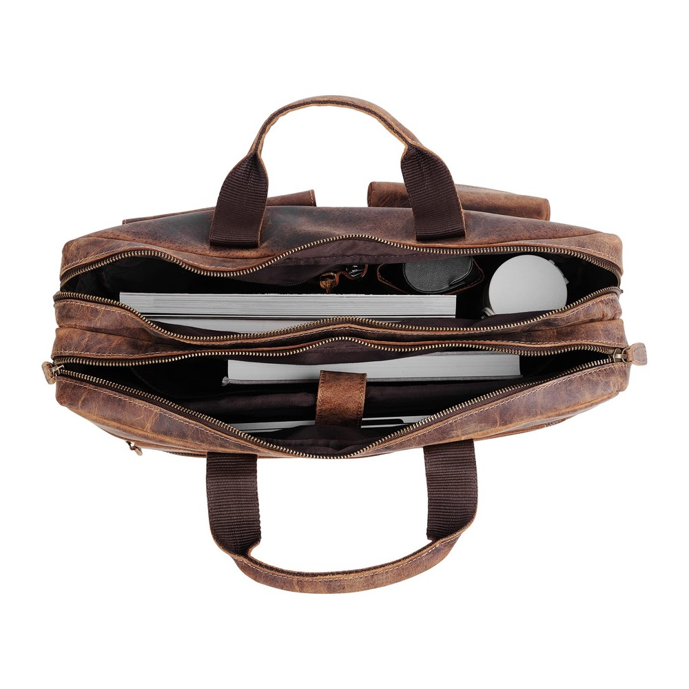 messenger briefcase for men laptop shoulder 16-inch leather laptop for men and leather office leather shoulder handmade leather messenger bag for men leather satchel shoulder bag for men 's laptop bag leather briefcase best handmade bag distressed best gifts for men computer bag leather Christmas valentine anniversary gifts for men and Premium Buffalo Leather & YKK Metal Zippers: Crafted from premium top-grain water buffalo leather by experienced craftsmen. All metal zippers used on this bag are from the renowned YKK brand, known for their durability and reliability. Trolley : Equipped with a convenient trolley strap at the back, allowing you to easily attach the bag to your suitcase for hassle-travel at airports. Sleek & Multipurpose Design: With dimensions of 16" (W) x 13" (H) x 5" (D), this bag can accommodate laptops up to 15.5 inches while maintaining a sleek, non-bulky look. It can be used as a briefcase, laptop messenger bag, or office satchel bag. Multiple Storage Sections: Features 2 large zippered compartments—with a padded section for laptops and valuables, and another for documents, journals, and files. Includes 2 side zip pockets for smaller items like wallets or diaries, as well as designated compartments for cards, pens, and mobile devices. Additionally, there’s a rear zip pocket and front pockets (with zip and button closures) for easy access to keys and frequently used items. Perfect Gift with : A great gift for any occasion—Christmas, Valentine’s Day, birthdays, or anniversaries. This bag comes with a -year , ensuring peace of mind..