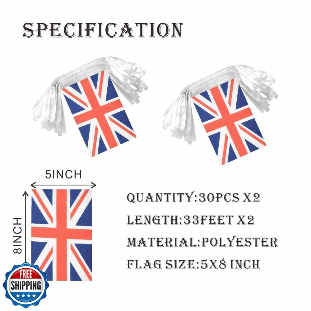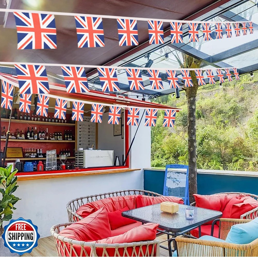 Lebei 2 Pack Union Jack Flag Banner String Small Mini 66 Feet 60 Pcs UK British Hanging Flags Decoration Features Specifications - Each rope is approximately 30 feet long with 30 small Union Jack flags,Including 2 ropes.Single flag -5 x 8Inch Craftsmanship - Made of 100% polyester our banner features satin rope, screen printing, the pattern can be clearly seen on the front and back. Fade resistance - The sharp and vivid colors,resistant to UV dyes,wind/rain and strong sunshine weather, the flag will not fade. Easy to Hang: britain flag banner is designed with ropes at both ends, making banner easy for you to hang in various occasions. You can hang small mini string flag on walls, classroom,room,balconies, gardens, fences, and other places to create a strong atmosphere, making festivals and celebrations more solemn and grand Decoration - Perfect decorations for sports event or grand opening of your business, school events ,parties, sports gatherings, and patriotic festivals. Shipping Free & Fast Shipping: We offer free shipping to most of the USA with a normal delivery time of 3-7 days. However, due to the current situation, additional delivery time (up to 3 weeks) may be required for some items. Alternative Carriers: We may use alternative carriers (e.g., USPS, FedEx, UPS) to ensure your package arrives safely and on time. Due to the use of multiple carriers, we are unable to provide a tracking number automatically. Handling Time: Orders are processed and shipped within 1-2 business days of receiving cleared payment. Shipping Restrictions: Shipping to Alaska, Hawaii, Puerto Rico, Guam, and other US territories may incur shipping charges or delivery restrictions. Please contact us before ordering, or your order can be refunded/cancelled. State Restrictions: Certain items may not be shipped to California due to state regulations. Contact for Tracking Updates: If you require tracking updates or have any concerns about the delivery of your order, please feel free to contact us, and we will be happy to assist you. Return Policy 30-Day Hassle-Free Returns: If you are not completely satisfied with your purchase, you can return the item for free within 30 days of receiving it for a full refund or exchange. Easy Return Process: Contact us, and we will provide you with a prepaid return shipping label and detailed instructions. No Restocking Fee: There are no restocking fees for returns. However, the buyer is responsible for return shipping costs if the return is not due to a seller"s error. Refund Processing: Refunds will be processed within 1 business day of receiving the returned item in its original condition. Feedback Your feedback is extremely important to us. We strive to provide the best products and customer service possible. If you are satisfied with your purchase, please take a moment to leave us a positive review. If you have any concerns or issues with your order, please contact us before leaving negative feedback. We are committed to resolving any problems and ensuring your satisfaction. Contact Us If you have any questions or concerns, please feel free to reach out to our customer support team. You can contact us through the eBay messaging system. We are available Monday to Friday, 9:00 am to 5:00 pm EST, and we will do our best to respond to your inquiry within 24 hours. Thank you for supporting our small family business!