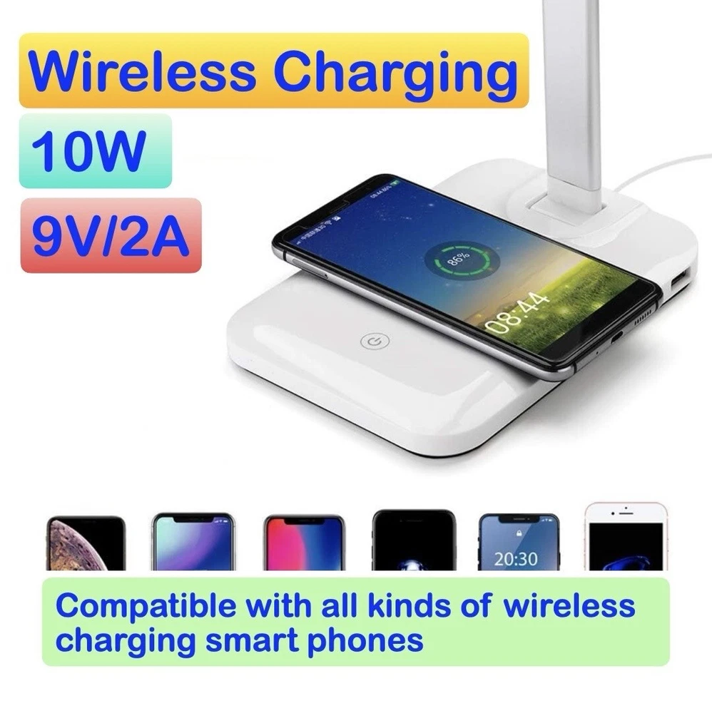 Light weight 3 color dimmable eye-caring LED light,compatible with apple and android wireless charging smartphones, it comes with additional USB port, fully adjustable,foldable for easy carrying. Dimmable 3 color lighting modes: white, soft white and mixed.