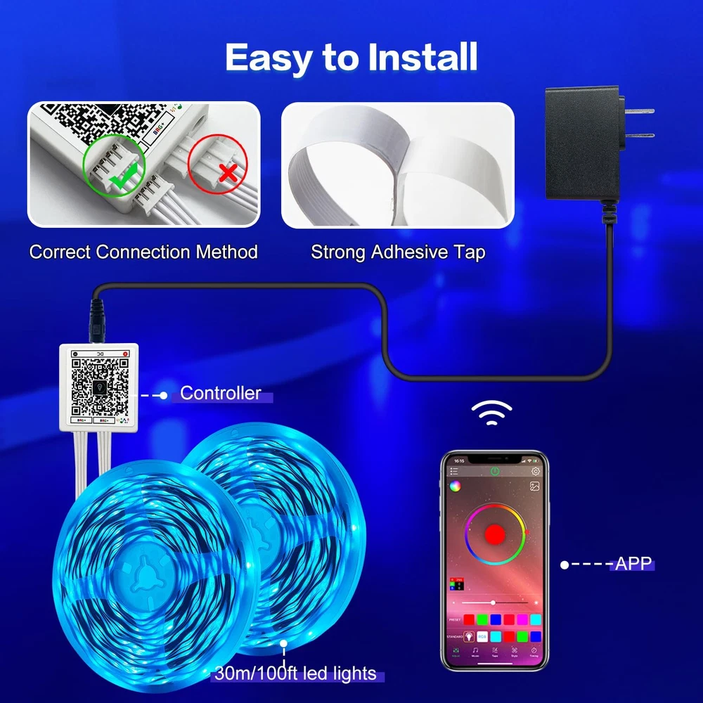 Super Quick and Easy Installation: The LED strip lights come with strong self-adhesive tape and can firmly stick on any clean and smooth surfaces like wooden and lacquer wall. Just follow the instruction on user manual, the whole set will only take several minutes to install. Long 100ft LED Strip: The LED lights for bedroom 100 ft is long enough to reach around your entire room and light up the whole place. You can install the RGB LED strip lights for bedroom, living room, kitchen, bar, gaming room, home theatre, corridor, staircase, etc. Wide Application: Besides everyday use, the RGB LED strip lights can also be used for wedding, anniversary, birthday, engagement, graduation, Christmas, Easter, Halloween, New Year, Thanksgiving, etc. These color changing LED lights can bring you a fantastic visual feast. Music Sync & Mic Mode: The LED strips will change colors and pulsate to the beat of the music on the phone. With a built-in high sensitive Mic, the LED strips will also react to the surrounding sounds detected by the Mic. These modes can produce spectacular light shows and dynamic decors to liven up the parties and holidays. Smart APP Control: The LED lights can be freely controlled via 'Happy Lighting' APP . These LED strip has lots of different modes, such as flashing, quick jumping, fading, etc. You can also create your own lighting effect and DIY with the APP. Timer Settings: The lights can automatically turn on/off at the scheduled time. Such smart LED lights for bedroom can make your room cozy and comfortable before bedtime and wake you up in soothing lighting every morning.