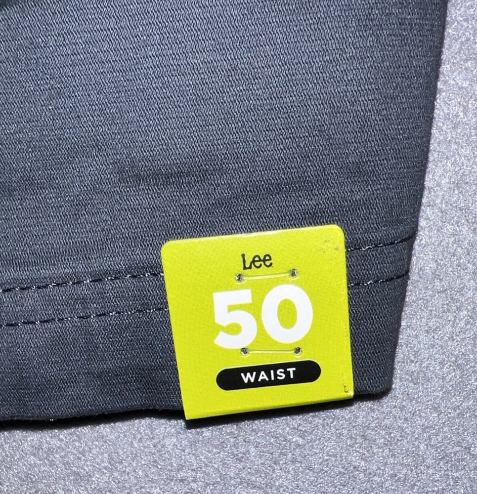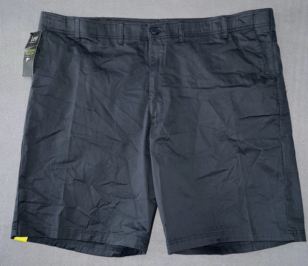 Closure: Zip Size Type: Regular Department: Men Vintage: No Character: Summer Season: Fall, Spring, Summer Personalize: No Fit: Regular Handmade: No Theme: American, Outdoor Brand: Lee Features: Easy Care, Lightweight, Pockets, Stretch Color: Blue Style: Bermuda Country/Region of Manufacture: Unknown Pattern: Solid Pocket Type: Slash Pocket Fabric Type: Canvas Inseam: 10 in Front Type: Flat Front Accents: Button, Zipper Material: Cotton, Spandex Size: 50 Fabric Wash: Dark Occasion: Casual, Travel Garment Care: Machine Washable Waist Size: 50