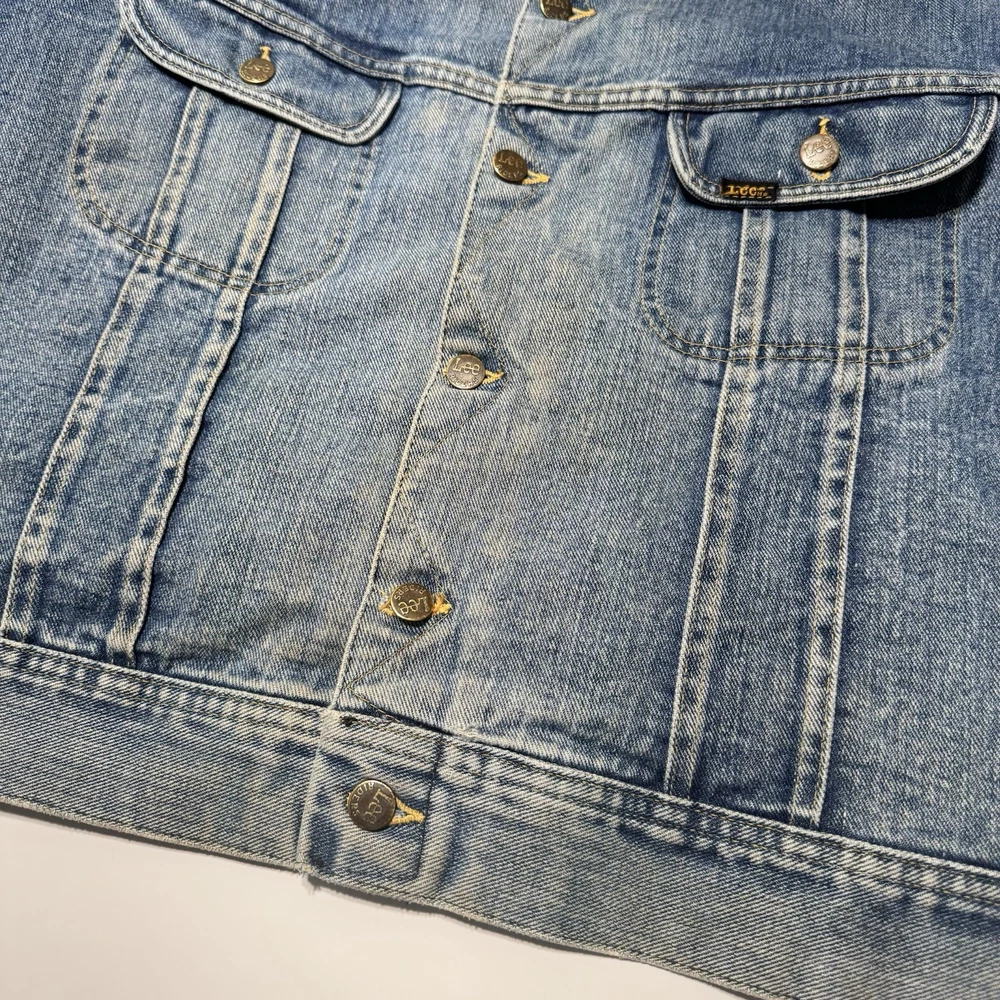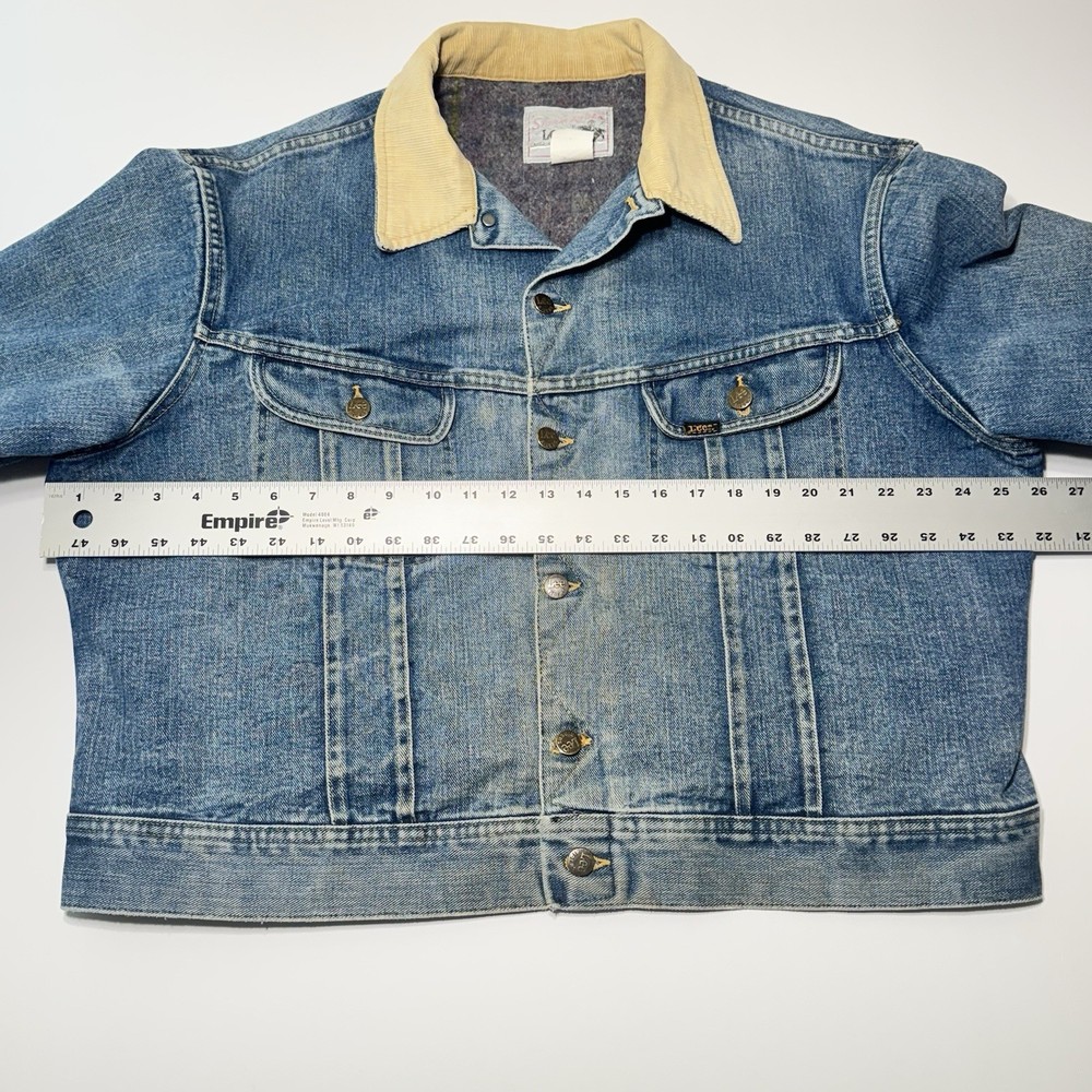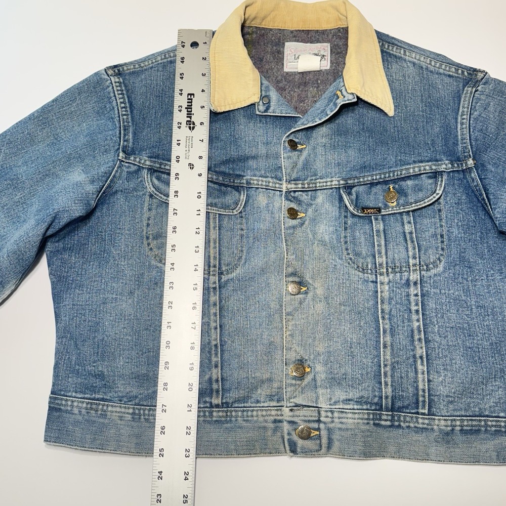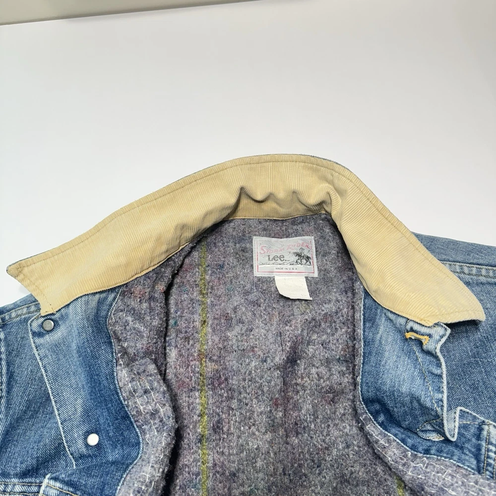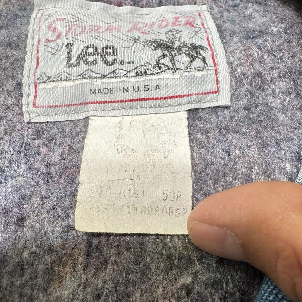 Lee Storm Rider Denim Jacket Size 50R Blanket Lined Vintage 70s Made In The USA This jacket is preowned and in good condition. Jacket has some signs of wear from use and age. Has some stains and a few small holes. Blanket lining on left bottom inside is coming apart. Getting thin going up on both sides. Collar is clean. All button are present. Denim is soft and broken in. See photos for details. Fast Shipping!!