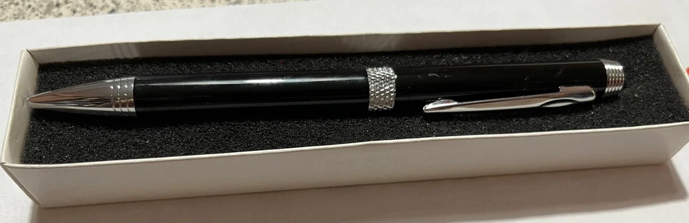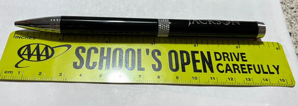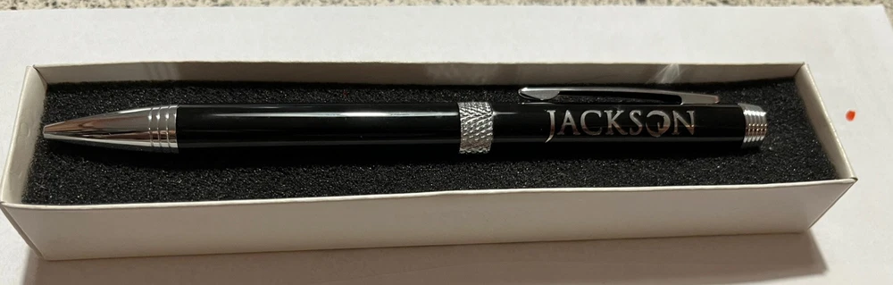 Leeds Ball Point Pen Glossy Black With Etched Chrome Trim JACKSON On Top Section of Pen. Twist to open and close. Very impressive looking! 5 5/8” Long x 3/8” Wide In Original Box