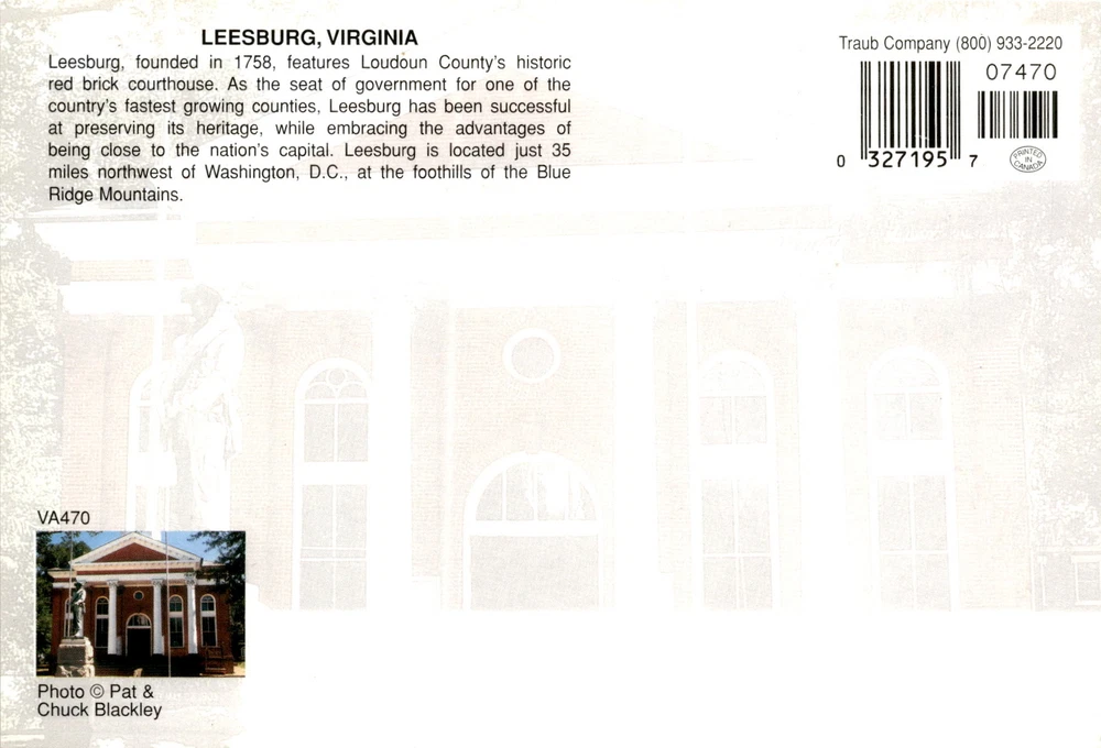 MAKE AN OFFER. THE MORE YOU BUY THE BETTER DEAL I WILL ACCEPT The postcard features a photograph of Leesburg, Virginia, showcasing its historic red brick courthouse. Leesburg was founded in 1758 and serves as the seat of government for Loudoun County, one of the fastest-growing counties in the country. The town has successfully preserved its heritage while also benefiting from its proximity to Washington, D.C.