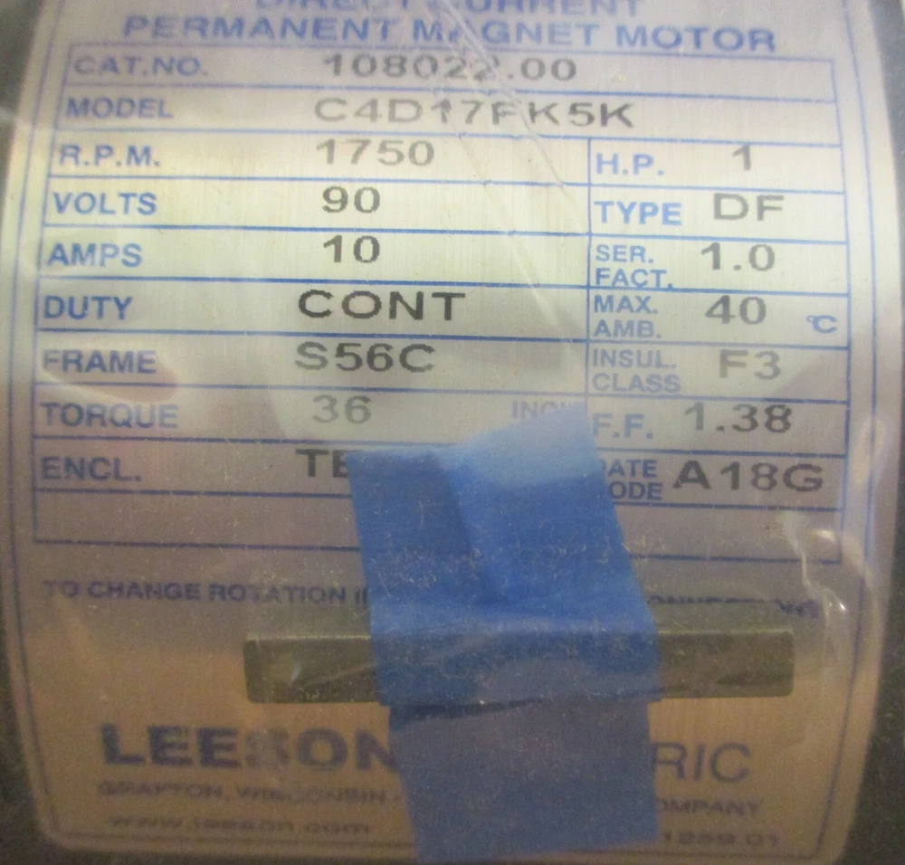 Motor For sale is a Leeson 108022.00 DC Permanent Magnet Motor C4D17FK5K 1750RPM 1HP 5/8" Shaft Dia. Item appears new and in excellent condition. Will come as shown and with what is pictured. May show minor imperfections from shelf wear but nothing that will impact performance. Shaft Dia: 5/8" Thank you for looking and please let us know if you have any questions. eTech Surplus Rochester, NY Shipping: Charged according to location. Please note that eBay charges sales tax, we do not. We at eTech Surplus strive to honestly and accurately describe each item we sell. Please feel free to contact us with any questions. International Buyers - Please Note: Import duties, taxes and charges are not included in the item price or shipping cost. These charges are the buyer's responsibility. Please check with your country's customs office to determine what these additional costs will be prior to bidding or buying.