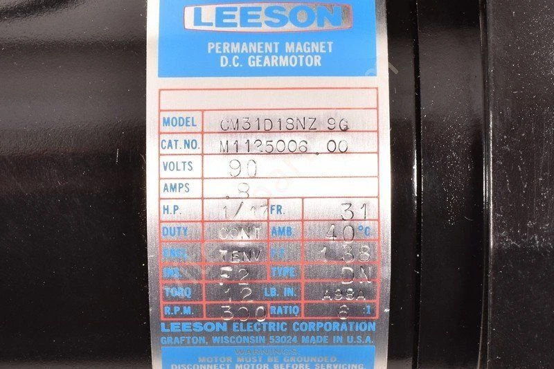 Leeson Electric Permanent Magnet Gearmotor type CM31D18NZ-9G, 90V, 0.8A, 300rpm, Olec part Nr.: 31M0T20. vitech.parts WITHIN THE EU, VITECHPARTS SELLS TO COMMERCIAL BUYERS ONLY!* VAT is already excluded from the selling prices. Provide your EU VAT number in the street or address field when placing the order to avoid any delays. *not applicable for customers outside the EU. CONTACT VISIT SHOP title description Controller boards Servo drives Inverters | Converters PLC's Power supplies Other controllers AC DC Servo Motors See full image See full image See full image See full image See full image Leeson CM31D18NZ-9G Leeson Electric Permanent Magnet Gearmotor type CM31D18NZ-9G, 90V, 0.8A, 300rpm, Olec part Nr.: 31M0T20. Vitech article #22105_1 In stock, shipped today!* Condition: New other Available quantity: 1 Free EU-delivery Returns accepted 🛡️ 100 DAYS WARRANTY, 100% WORRY FREE With our 100 days return warranty on all our used, refurbished and new spare parts, you receive all items 100% worry free! In the unlikely event of any issues within the first 100 days, our 3R policy kicks in: REPAIR, REPLACE, REFUND. Explore our comprehensive warranty policy online on our VitechParts website for more details.