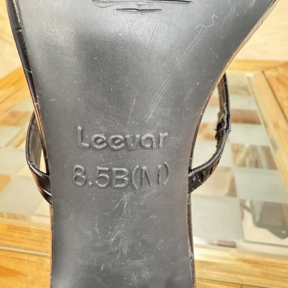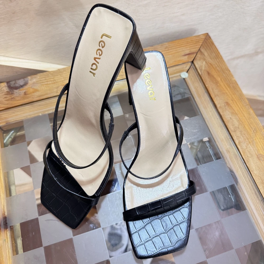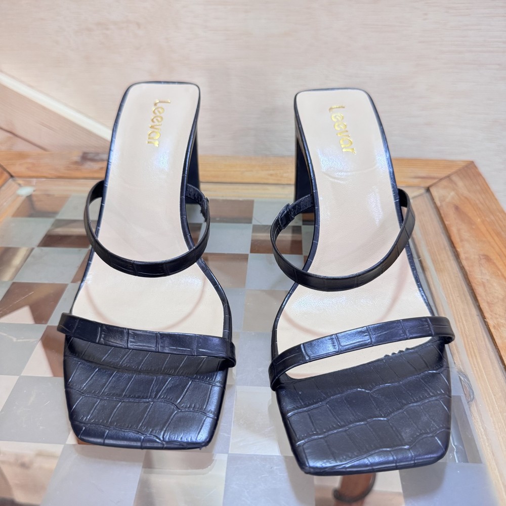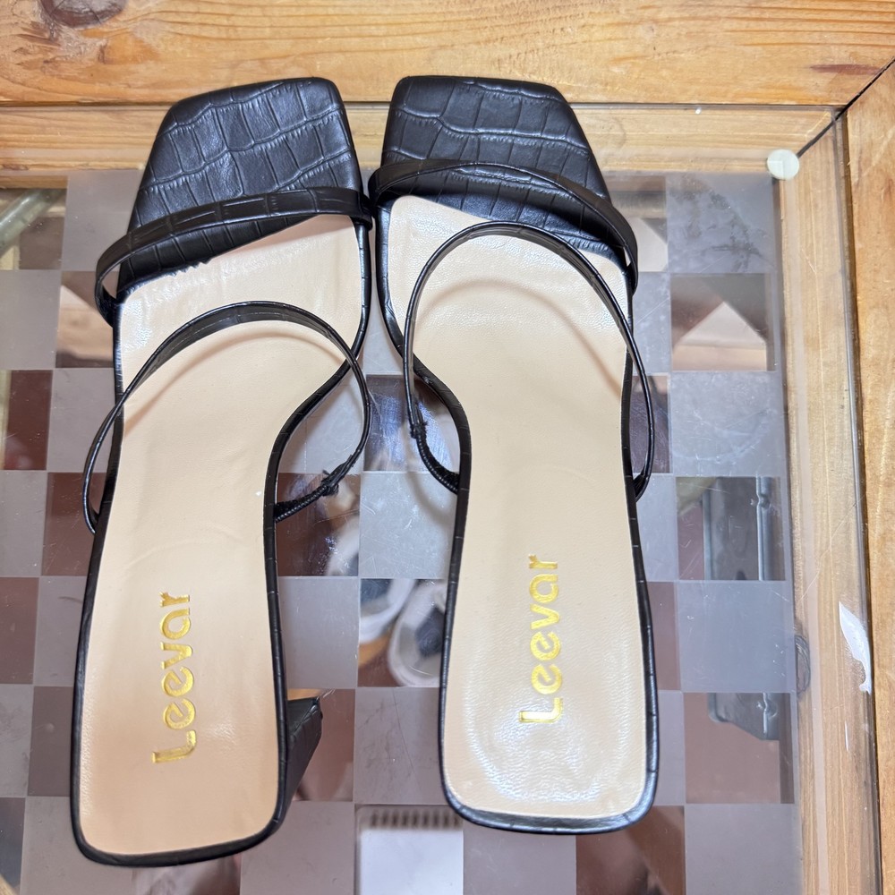 Leevár Shoes Womens Size 8.5 Black Strappy Block Heel Croc Embossed Sandals Condition: Gently worn, no visible flaws Features two thin straps across the foot for a secure fit All-over faux croc embossed texture for elevated style Modern open square toe design Comfortable padded insole with gold Leevár branding Thick block heel for stability and comfort Slip-on style, backless Size stamped on sole: 8.5B (M) Womens Perfect for dressy occasions, parties, or summer events Classic black color pairs easily with outfits
