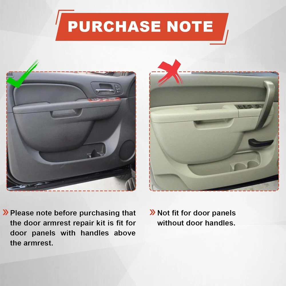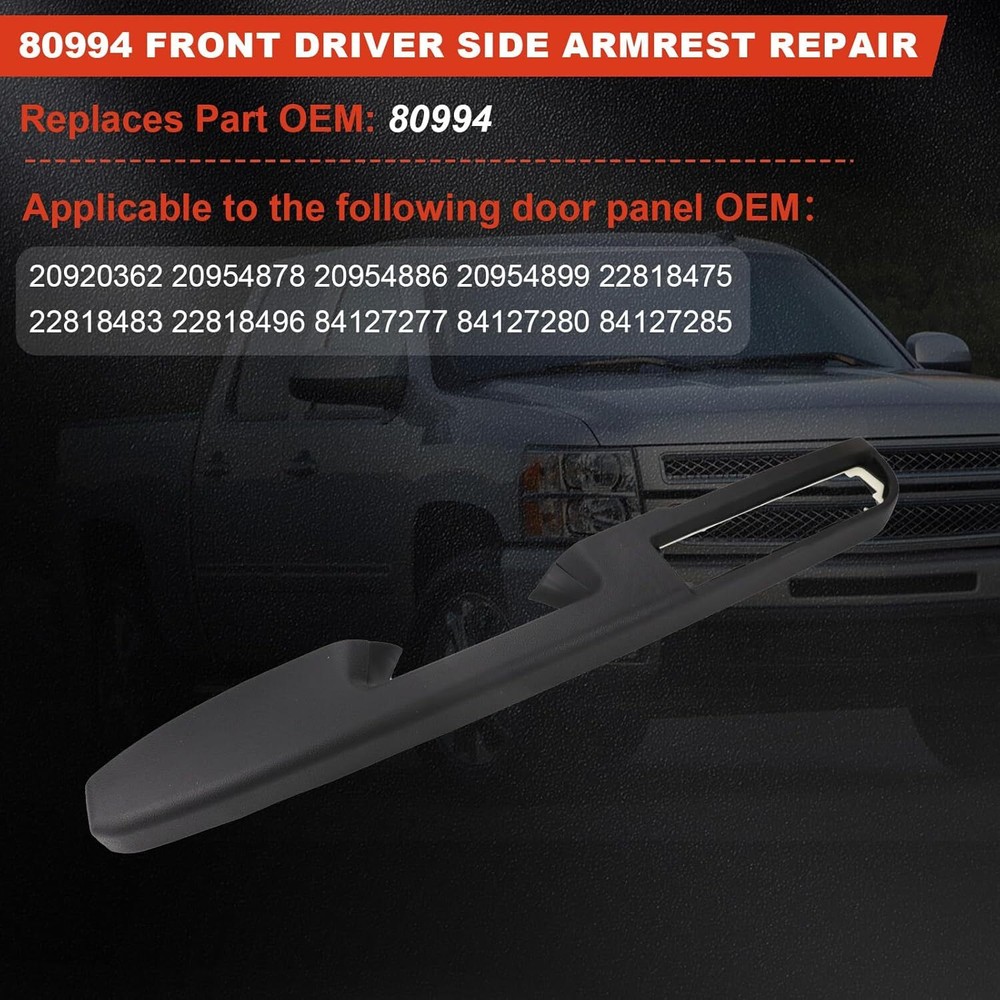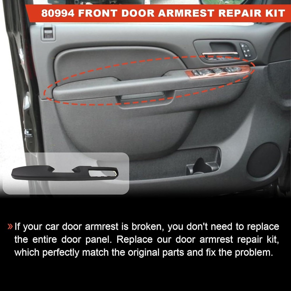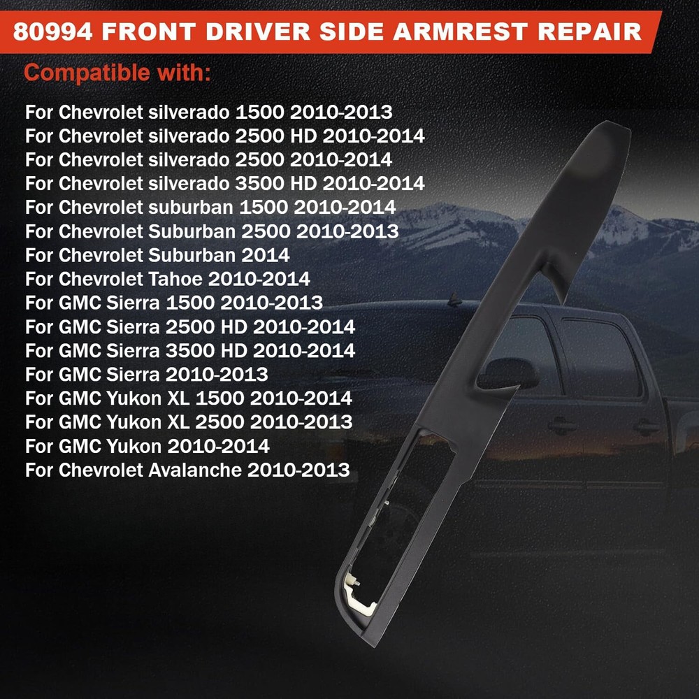 Feature: Type:Door Armrest Color:Black Material:Polymer Easy Clean,Easy Installation Manufacturer Part Number:80994 Ensure Fit: 80994 Front Driver Side Armrest compatible with Chevrolet/GMC Models, Please check your part number is consistent with ours before purchasing to ensure this repair kit is a perfect match for your vehicle and avoid compatibility issues Cost-Effective: This repair kit offers a more affordable solution compared to expensive dealer armrest repair kit or hard-to-find used parts, No need to replace the entire door panel. Helping you save on repair costs Stronger Design: Comprehensive quality upgrade, this kit prevents the bending and flexing issues common with the original plastic design, providing a more durable and long-lasting repair Simple Repair: The kit includes pre-attached mounting studs that precisely match your vehicle's door panel, making installation quick and easy. llowing you to complete the repair process easily Application-Specific: This repair kit is only suitable for door panels where the handle is above the armrest. Fit for: For Chevrolet silverado 1500 2010-2013 For Chevrolet silverado 2500 HD 2010-2014 For Chevrolet silverado 2500 2010-2014 For Chevrolet silverado 3500 HD 2010-2014 For Chevrolet suburban 1500 2010-2014 For Chevrolet Suburban 2500 2010-2013 For Chevrolet Suburban 2014 For Chevrolet Tahoe 2010-2014 For GMC Sierra 1500 2010-2013 For GMC Sierra 2500 HD 2010-2014 For GMC Sierra 3500 HD 2010-2014 For GMC Sierra 2010-2013 For GMC Yukon XL 1500 2010-2014 For GMC Yukon XL 2500 2010-2013 For GMC Yukon 2010-2014 For Chevrolet Avalanche 2010-2013 Package include: Door Armrest*1