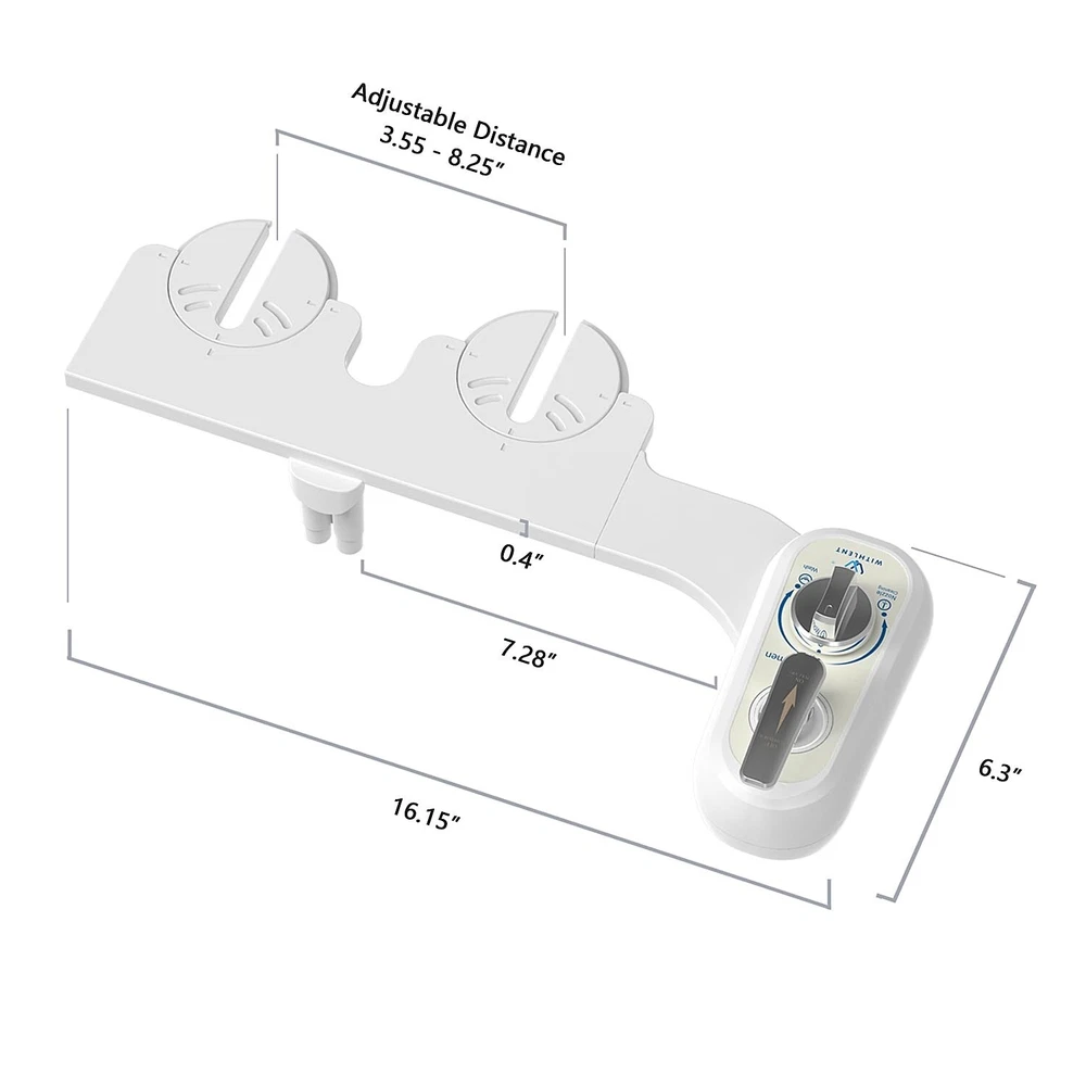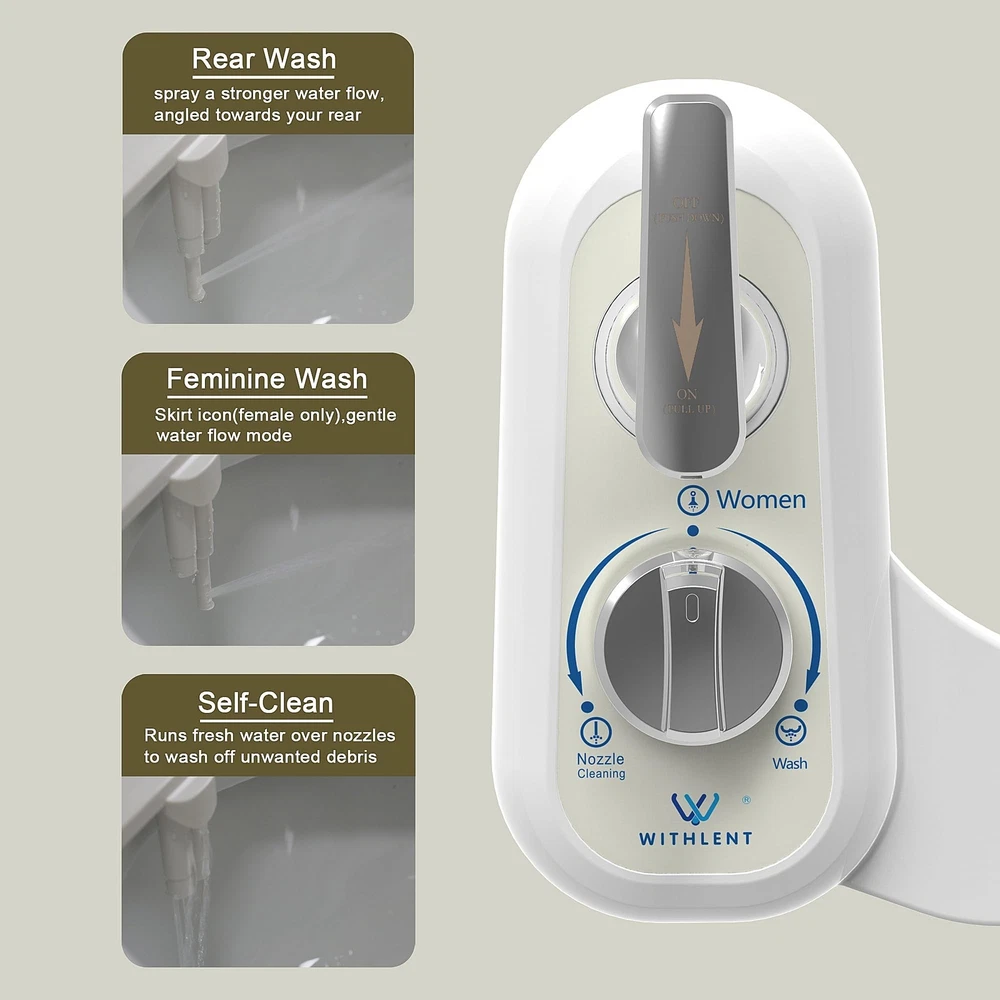 Left Hand Bidet Attachment for Toilet - Self-Cleaning control panel on left side Dual Nozzle (Frontal & Rear Wash) Non-Electric Adjustable Water Pressure, Water Bidet Toilet Seat Attachment Product Details Manufacturer: WITHLENT Item Weight: 1.5 pounds Product Dimensions: 16.5 x 9.8 x 4 inches Country of Origin: China Item model number: J1016-03 Color: White Included Components: WITHLENT Bidet Body * 1, Brass T-Adapter * 1, Teflon Tape * 1, Cold Water Connection Metal Braided Hose * 1, Installation and User Guide * 1 Batteries Included?: No Batteries Required?: No Date First Available: August 16, 2024 THE BIDET FOR LEFT-HANDED PEOPLEDual Nozzle Bidet is for left-handed people and anyone in need of a bidet attachment with controls on the left side. water pressure can be easily adjusted by operating rod and the nozzles are positionable ensuring a thorough and precise clean. Say no to toilet paper. FASTEST, EASIEST INSTALLATIONU-shaped adjustment plates allow for quick and easy installation without removing the entire toilet seat. Stainless steel hinges allow for adjustments even after installation. DUAL WASH MODESThe rear wash sprays a stronger flow towards the rear. The feminine wash sprays a softer flow towards the front. The feminine wash also helps to keep you clean during monthly cycles and comes in handy for new or expecting mothers. SELF-CLEANING NOZZLESMaintain hygiene with self-cleaning nozzles that retract back into protective housing when not in use. Enjoy a consistently clean bidet experience with minimal effort. NO KIDDING 12-MONTH WARRANTYWe are always here to make sure you are 100% satisfied, so anytime you have problems. the most effective way is to find our after-sales support. They will be happy to solve any problems for you.