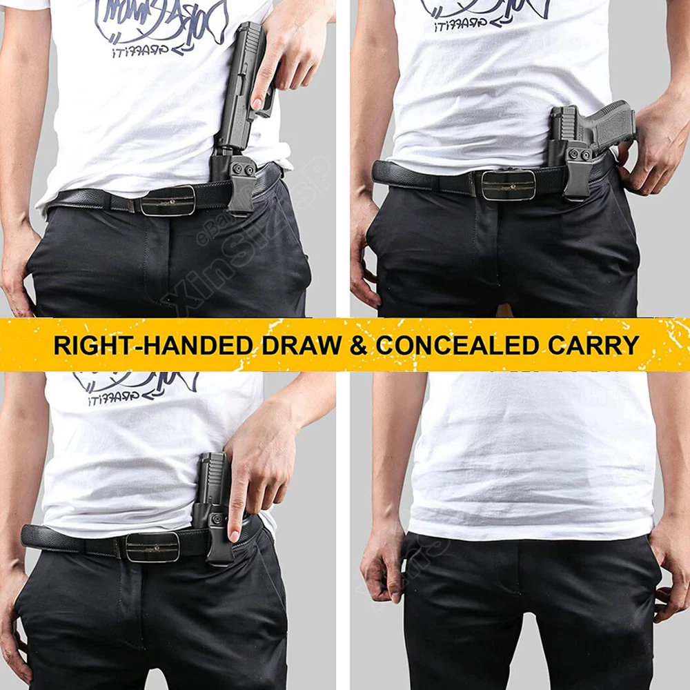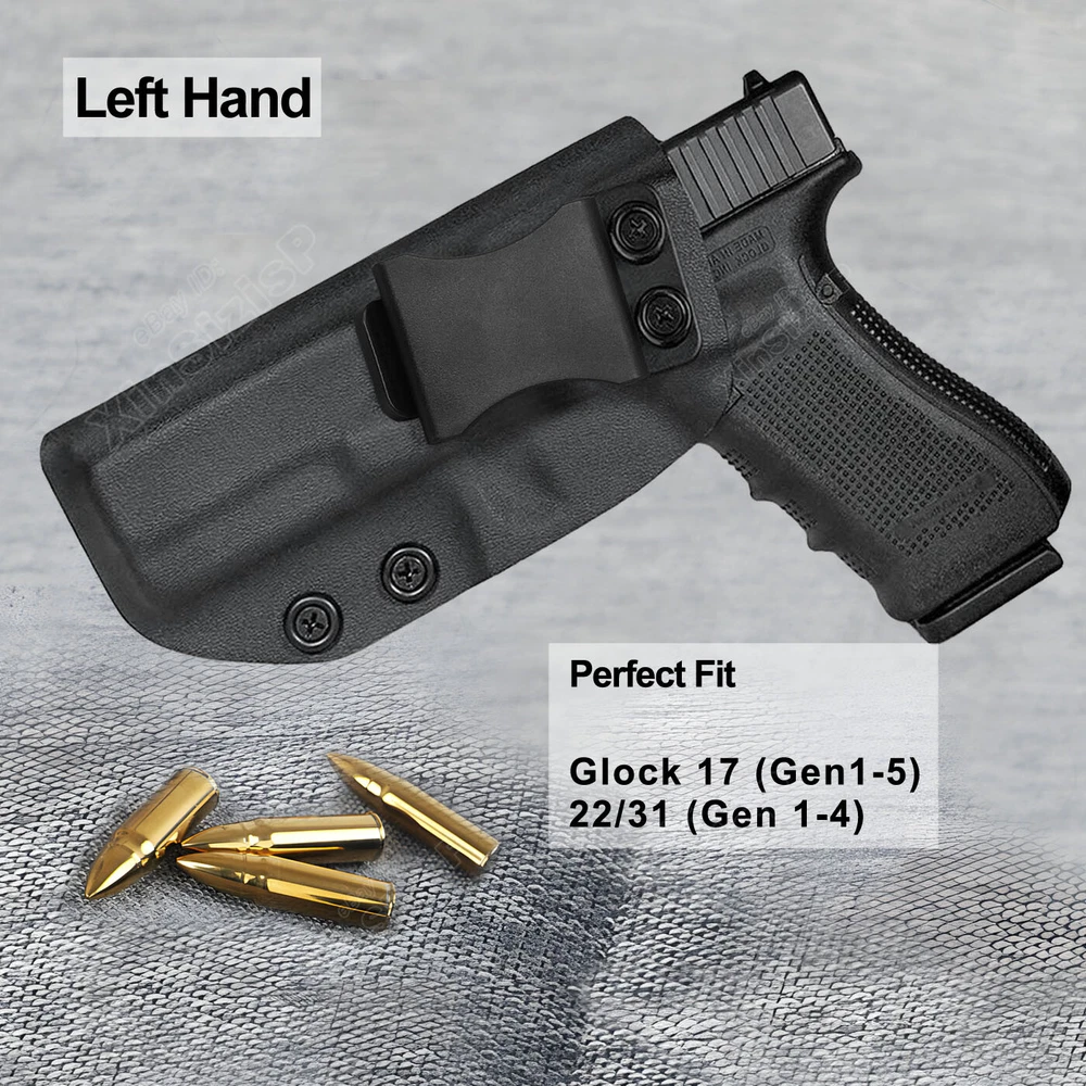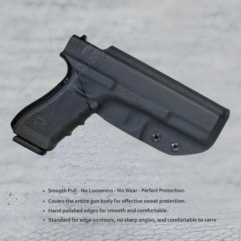High Quality Military & Police Grade Polymer IWB Holster Specially Designed For Fast Draw During Duty Or Shooting Competition. Left Hand Draw Inside Waistband Holster Holster fit Glock 17 Gen1-4 4.49" 9mm Luger Glock 17M 4.49" 9mm Luger Glock 17 RTF2 9mm Luger Glock 17 Pro 4.49" 9mm Luger Glock 17T 9mm Luger Glock 17C Gen3-4 4.49" 9mm Luger Glock 17L Gen1-2 6.02" 9mm Luger Glock 22 Gen2-4 .40 S&W Glock 31 Gen3-4 .357 SIG Glock 37 Gen3-4 .45 GAP Materials & Durable Made of durable high-tech Kydex materials - Stronger than leather will wear out, the Kydex holster will not wear out and get flimsy. CARRY WITH CONFIDENCE: Please feel free to use our portable concealed holster to protect for Glock 17 Pistol. This is our high-quality KYDEX IWB Holster tailored for Glock 17 / Glock 22 / Glock 31 model. It is not only highly precise, but also rugged and durable, and can be hidden and portable, so you can protect yourself anytime, anywhere. Concealed Carry inside the waistline carry The combat-proven Holster by Tactical Scorpion Gear is a step forward in holster design and technology. COMPATIBILITY: The holster will fit any standard size 1.5 inch belt or lower. It WILL NOT fit Glocks with any aftermarket attachments (i.e. laser, flashlight, etc) however aftermarket sights are ok. Ease And Comfort Easy on / Easy off - No need to undo your belt every time you wear your holster.Sweat-proof- Protect your weapon from salty perspiration and not absorb sweat.Adapt to every environment In the Package: · 1*Holster Shipping: Ships same day or next except Sundays and Holidays ! Free shipping! Ship by USPS First Class Package. 100% MONEY BACK GUARANTEE. Any question please be free to contact with us .Thanks!