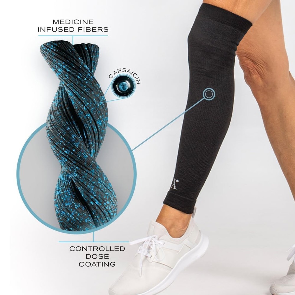 "Experience all-day relief with the Pain Relieving Leg Compression Sleeve, an innovative activewear solution for both men and women. Crafted with a unique combination of pain relief and support, this leg compression sleeve is infused with Capsaicin, providing targeted relief for joint pain, muscle fatigue, calf cramps, sprains, and more. lasts 3X longer than traditional pain relievers, providing all-day relief that withstands 15+ home washes or approximately 150 hours of wear. The nylon and spandex construction ensures a comfortable fit under clothes, delivering active ingredients to your body throughout the day. For a proper fit, measure the circumference of your thigh 5.5 inches above the top of your kneecap. Our sleeve fits best with a circumference between 15-23.5 inches. Proudly made in the USA, products utilize Healthwear Technology to relieve symptoms directly at the source. This lower leg compression sleeve not only alleviates pain associated with joint pain, muscle fatigue, and more but also aids in post-workout recovery for issues like shin splints and muscle cramps. Wash in cold water. Dry flat. Do not bleach. Don't let pain hold you back, live pain-free with ." All Day Relief: Our leg compression sleeve combines pain relief with support to alleviate soreness & reduce swelling. compression sleeves are innovative activewear that last 3X longer compared to other pain-relieving creams or sprays Medicated Fabric: Each compression sleeve has Capsaicin medicine woven into the sleeve to help target pain directly. Simply slide on the leg sleeve, and Capsaicin is activated upon skin . The medicine lasts for 15+ washes or approximately 150HRs Live Pain-Free: Our sleeves deliver active ingredients and are effective in easing pain & helping to alleviate the symptoms of joint pain, muscle fatigue, calf cramps, sprains and more. This sleeve acts as both a knee compression sleeve & calf compression sleeve Proper Sizing: Our sleeve is made from nylon & spandex to stretch & stay in place without restricting mobility. For best fit, measure the circumference of your thigh while standing, 5.5 inches above your kneecap. Fits circumference's between 15-23.5 inches Healthwear Technology: garments relieve symptoms by using medicated infused fabrics for all-day relief that lasts consistently longer than typical patches or creams. Plus, products are proudly created and made in the USA