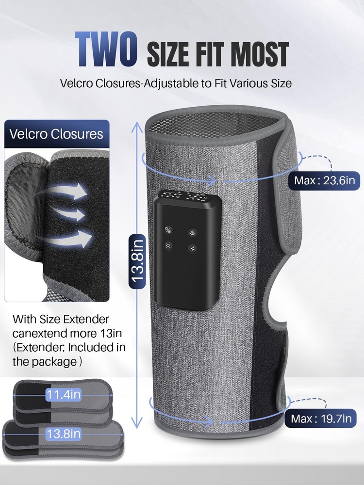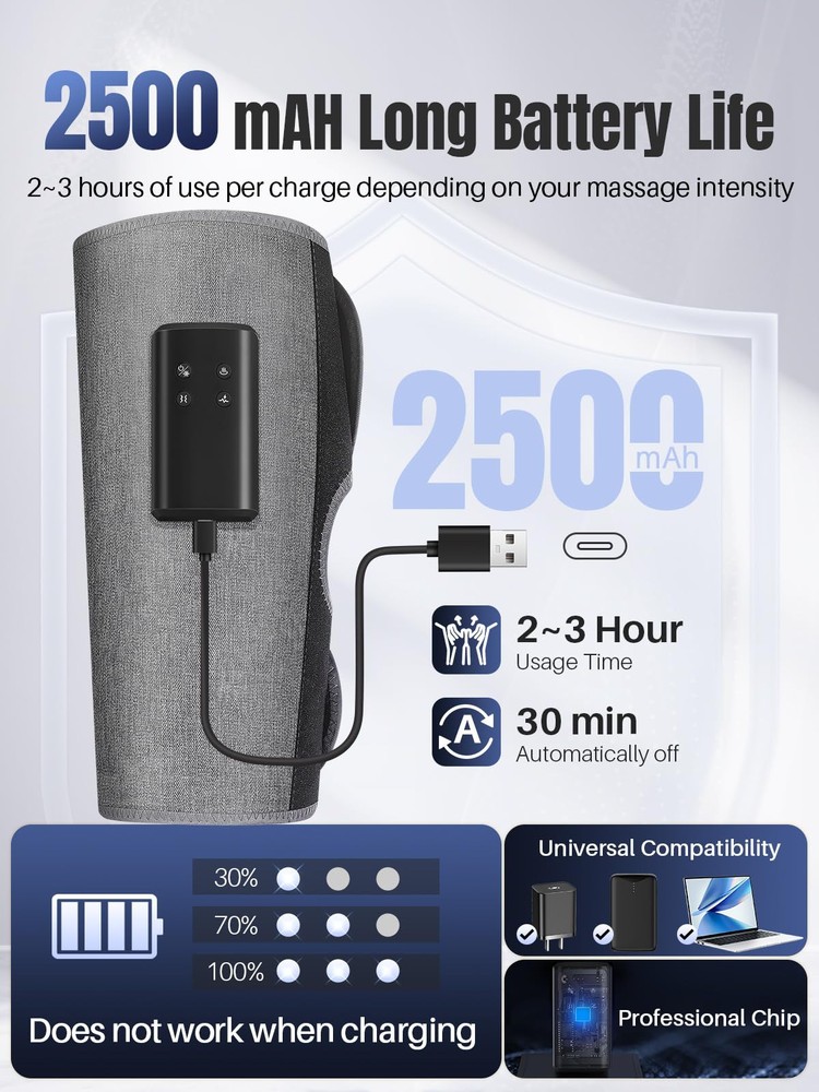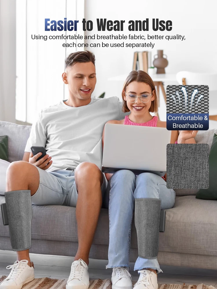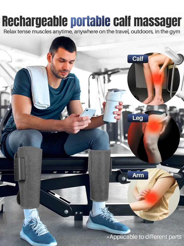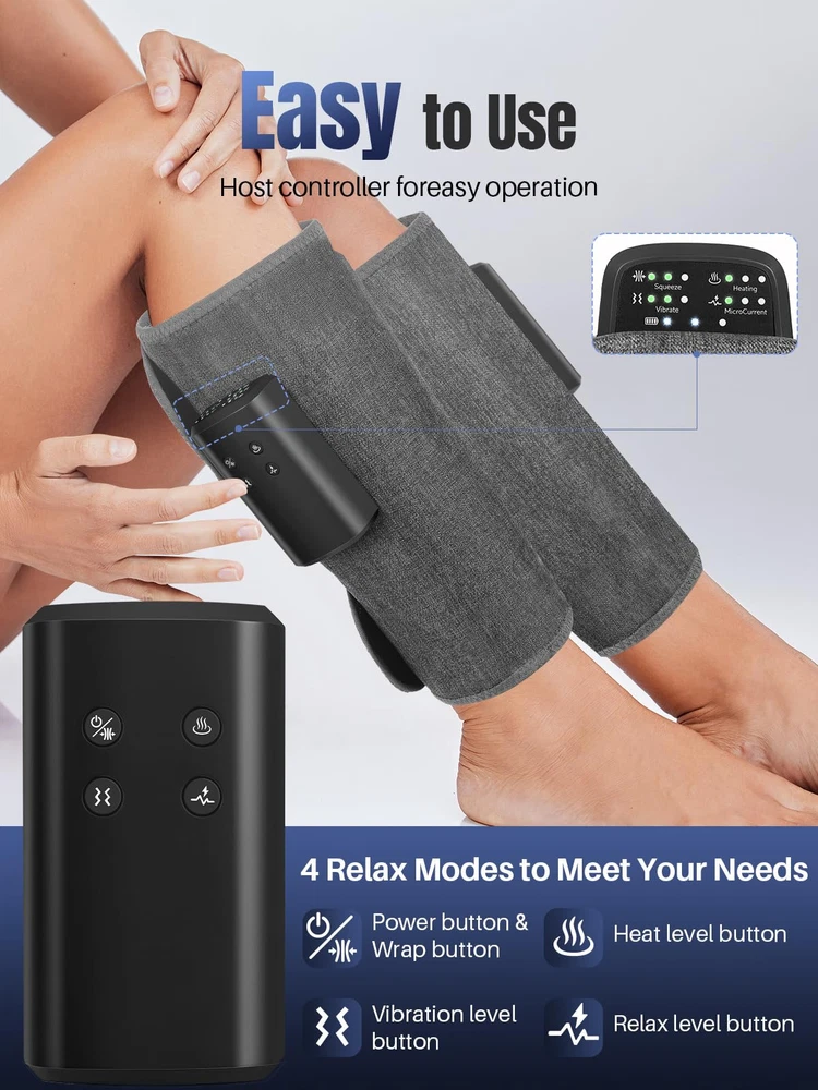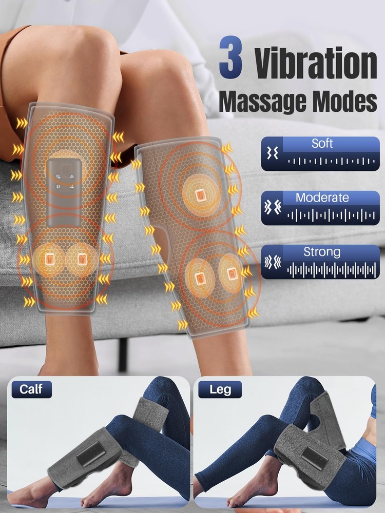 【Three Adjustable Heat Settings for Personalized Comfort】 Customize your heating experience with three heat levels—Low (40-45°C), Medium (45-55°C), and High (55-60°C). The warmth not only provides cozy relief but also enhances relaxation, making this leg massager perfect for cold days and post-workout relaxation. 【3 Vibration Massage Levels with Auto-off】 This calf massager features three adjustable vibration levels that effectively help relieve tired calves while letting you enjoy soothing warmth. Perfect for relaxing tired muscles after exercise, this portable leg massager also includes a smart 30-minute auto-off feature. 【Portable Cordless Leg Massager for Anytime, Anywhere Use】 Enjoy the freedom of relaxation on the go! This Wireless calf massager is designed with a built-in rechargeable 2500mAh battery for cordless convenience. With no external controllers or tubes required, it’s easy to take wherever you need it. The Type-C charging port is compatible with most USB outlets, making it simple to recharge at home, in the office, or while traveling. 【Adjustable Fit, Comfortable and Breathable Material】 This rechargeable leg massager is designed with Velcro straps and four extension straps to ensure a secure fit. The flexible design provides comfort for most users and can be easily shared with family and friends. Made of soft and breathable material, it remains comfortable even for long periods of use. When wearing it, place it on your calf with the indicator screen facing up and adjust the fit as needed. 【Thoughtful Gift for Someone You Love and Care About】 Wondering what gift to give to your loved ones? This leg massager is perfect for relieving muscle soreness and enhancing relaxation with customizable settings and a portable design. It is a meaningful gift for anyone seeking comfort and relief, and is perfect for giving to friends, family, and loved ones on birthdays, holidays, or any special occasion.