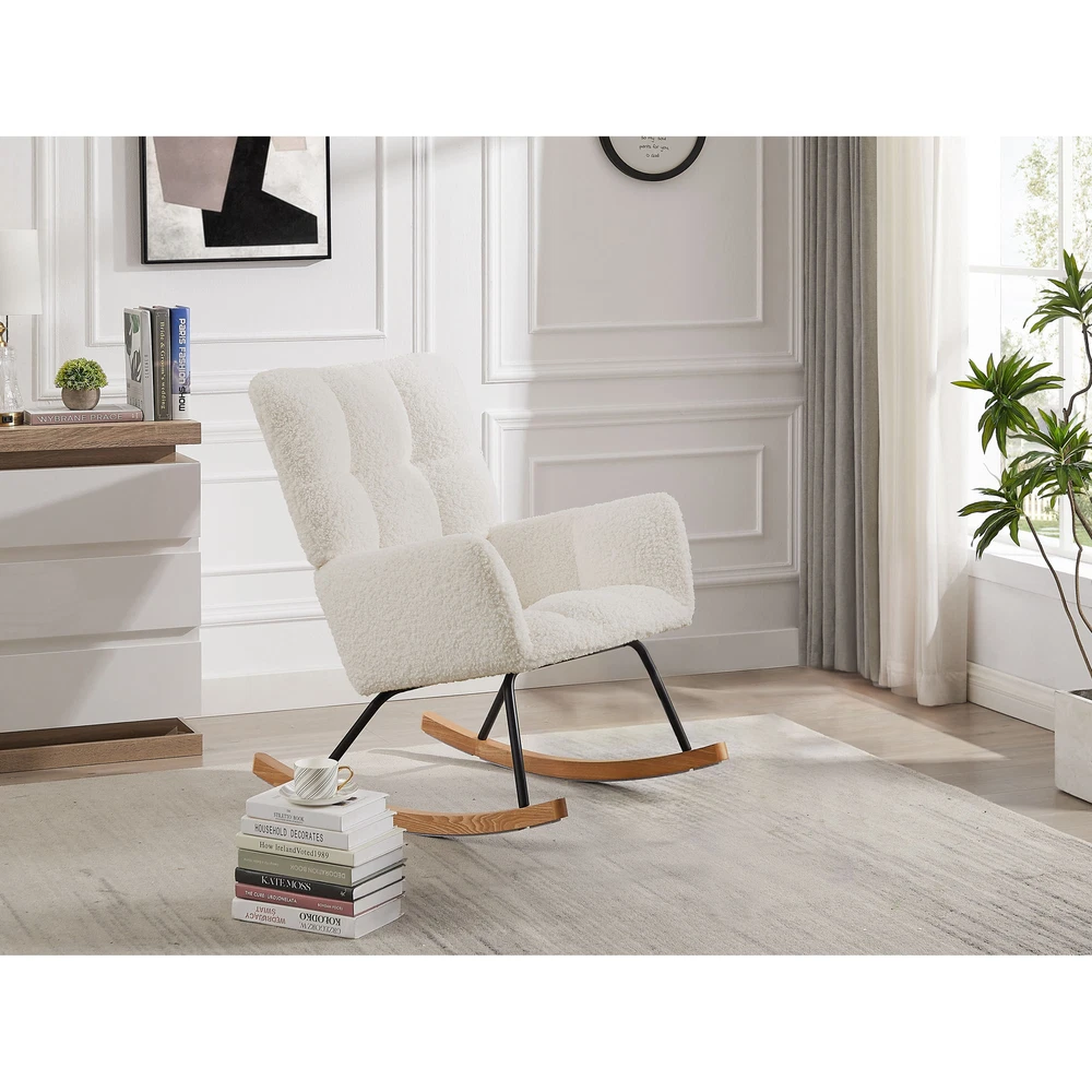 Nursery Rocking Chair Armchair for Mom and Baby Modern Glider Chair with Soft Seat and High BackrestERGONOMIC DESIGN - The tilt angle of the backrest of this rocking chair is designed with an ergonomic curve, and the high backrest provides perfect support for the back. Including the armrests of the chair, providing great comfort. Lying on the rocking chair and shaking, we can feel a lot of relaxation.EASY ASSMBLE - Assembling this rocking arm chair is not difficult. This rocking chair can be easily assembled by following the clear instructions.SUPERB QUALITY - The seats are made of soft and skin boucle, which is durable and not easily deformed.STURDY and STABLE - The nursery rocking chair is made of a mix of metal and solid wood, which provides reliable and stable support. During nap time, Free Shipping Over $49.99* Details Leisure Sofa Glider Chair,Comfy Upholstered Lounge Chair Product Description: Nursery Rocking Chair Armchair for Mom and Baby Modern Glider Chair with Soft Seat and High BackrestERGONOMIC DESIGN - The tilt angle of the backrest of this rocking chair is designed with an ergonomic curve, and the high backrest provides perfect support for the back. Including the armrests of the chair, providing great comfort. Lying on the rocking chair and shaking, we can feel a lot of relaxation.EASY ASSMBLE - Assembling this rocking arm chair is not difficult. This rocking chair can be easily assembled by following the clear instructions.SUPERB QUALITY - The seats are made of soft and skin boucle, which is durable and not easily deformed.STURDY and STABLE - The nursery rocking chair is made of a mix of metal and solid wood, which provides reliable and stable support. During nap time, gently shake the baby to fall asleep.Comfy Upholstered Lounge Chair with High BackrestErgonomic glider and footrest setWith high back, wide armrest and seat, the nursery glider perfectly fits your body curve to offer better support and more comfortable sitting experience.Upholstered rocking chairUpholstered recliner ensures ideal balance and smooth movement, not only suitable for the elderly to sit on the rocking chair to read the newspaper or watch TV.Rocking Chair Mid-Century Modern Nursery Rocking Armchair Upholstered Tall Back.ColorPinkSpecial FeatureArm RestRecommended Uses For ProductBedroom,Living RoomStyleModernForm FactorErgonomic,Modern,Rocking,TiltMaterialBoucle+metal(iron) +solid woodCountry of OriginChinaSurface RecommendationHard Floor