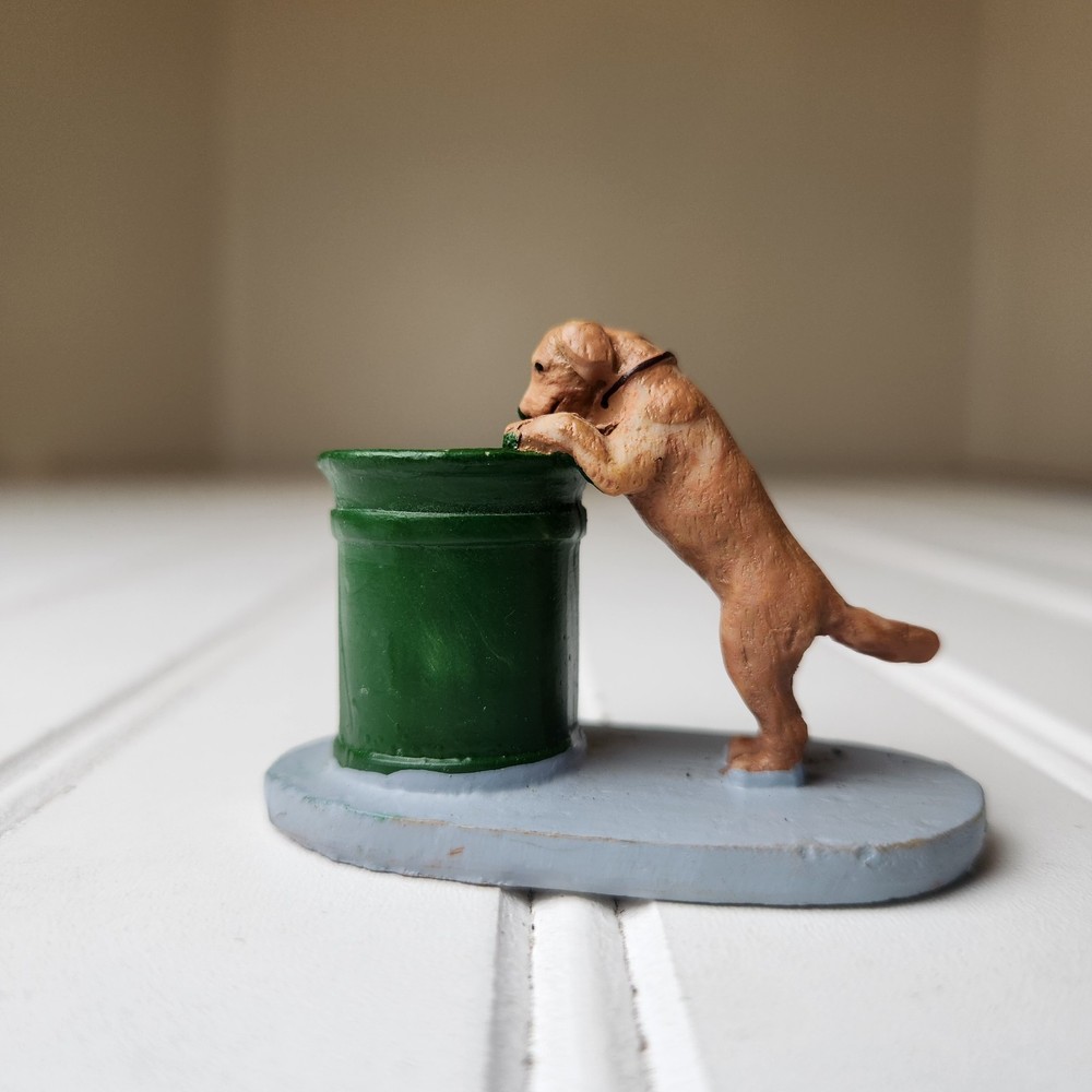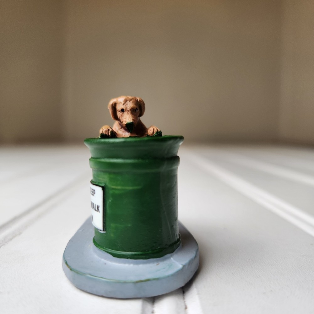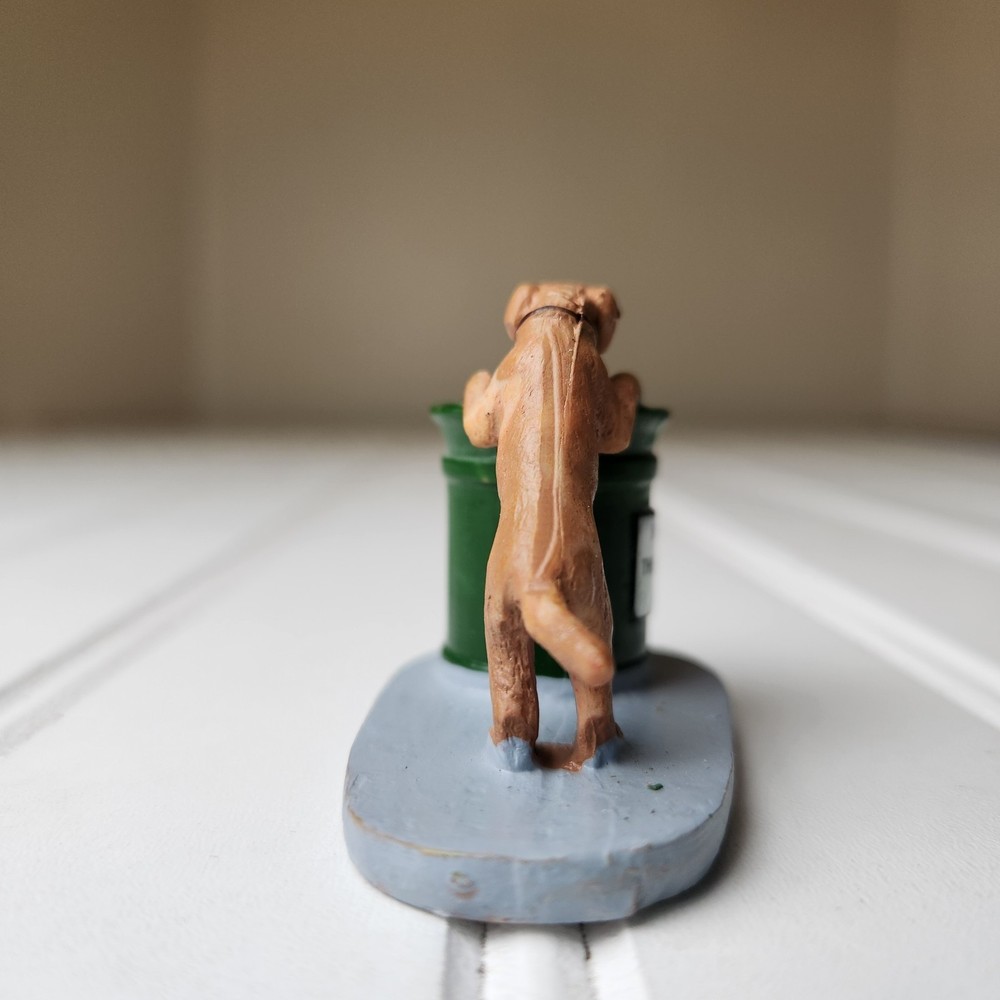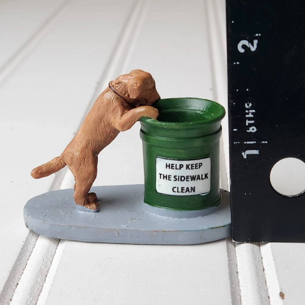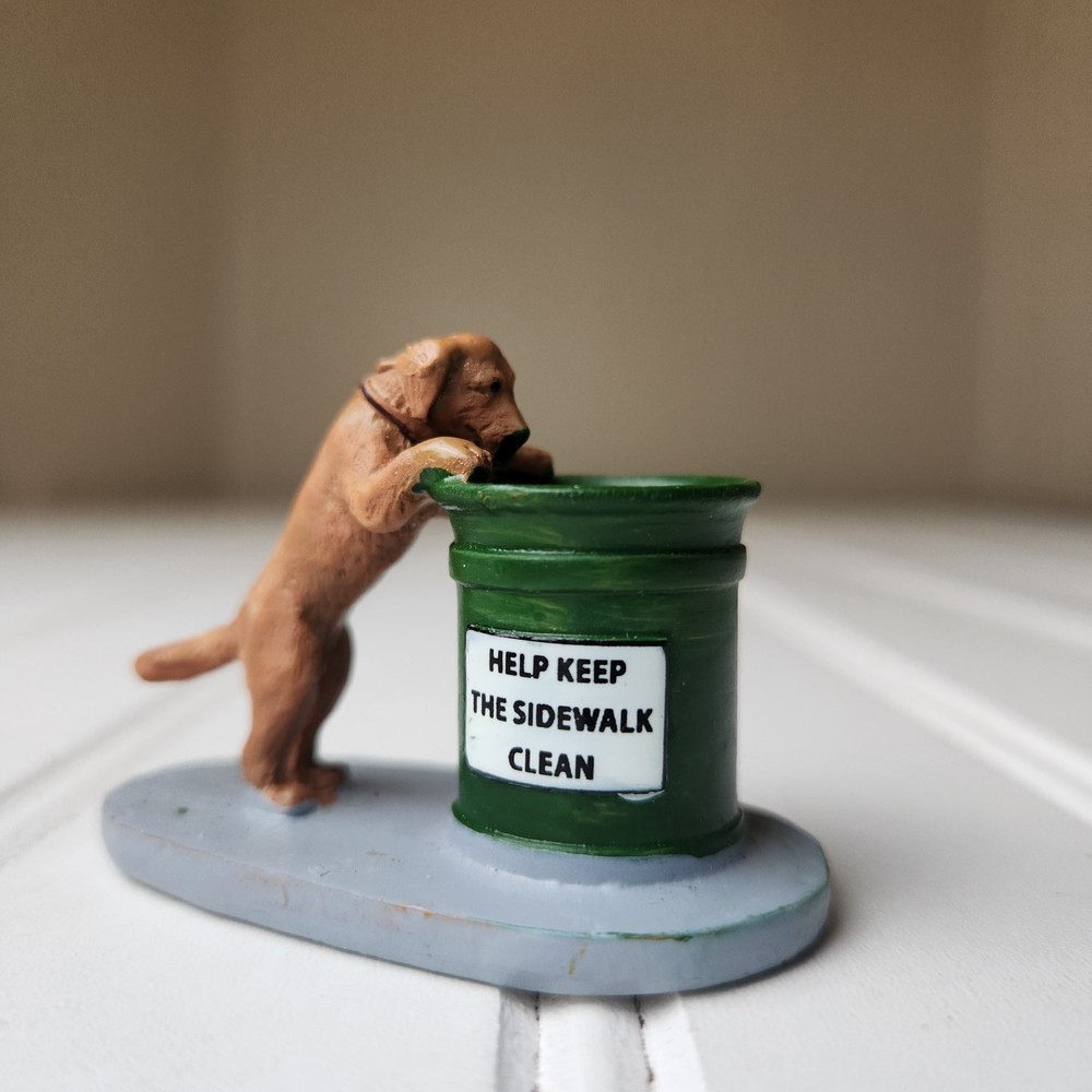 The Lemax Christmas Village #14364 Dog Help Keep Sidewalk Clean figurine is a hand-painted, miniature accessory designed to be placed in any room during the holiday season. This collectible piece features a dog theme, showcasing a puppy helping to keep the village town clean. Made of polyresin, plastic, and metal, this American-style figurine is a part of the Lemax General Products collection and is suitable for display on a wreath, mantel, end table, foyer table, furniture, kitchen cabinets, or dining table. Perfect for adding a festive touch to your holiday decor, this Lemax figurine is a charming addition to any Christmas village display. Dog only missing sign. Good pre-owned condition
