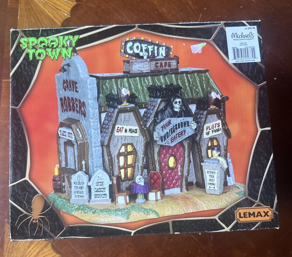 Lemax Spooky Town Coffin Cafe Porcelain Lighted Building #45675 With Light & Box New open box this was purchased at a estate sale Looks like it has never been used haunted cafe is still in plastic wrap and the light bulb in plastic wrap. Please see pictures for details Kindly send me a message if you have any questions. Thank you for looking 🎃 Bin 14
