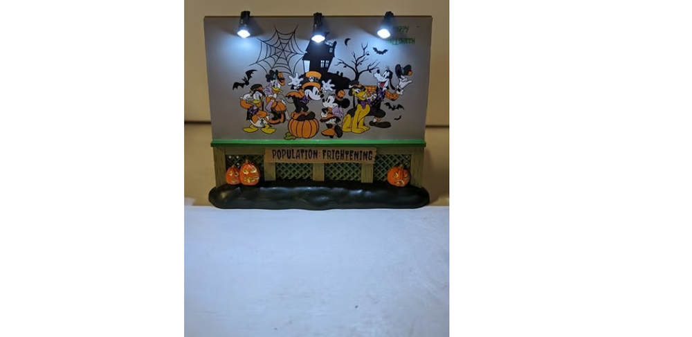 This Custom Lemax Spooky Town Lighted Billboard is a fantastic Halloween collectible! The Disney Mickey & Friends design is adorable and adds a playful spooky vibe to any display. The lights make it stand out, and the compact size is perfect for shelves or tabletops. Brand new and well-packaged, it arrived safely with USPS tracking. Shipping was reasonable at $10.00. A must-have for Disney and Halloween fans—highly recommend!