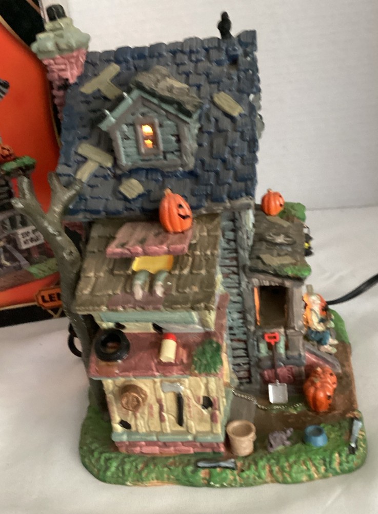 The Lemax Spookytown Creepy Neighborhood House is a ceramic and porcelain lighted building from the Spooky Town collection. Released in 2017, this retired Halloween-themed piece features a haunted house design suitable for seasonal displays. Part of the Lighted Buildings series, it illuminates to create a spooky ambiance for Halloween decorations. This collectible item captures the essence of a creepy neighborhood setting, making it a unique addition to any village or house display for enthusiasts of holiday and seasonal decor.