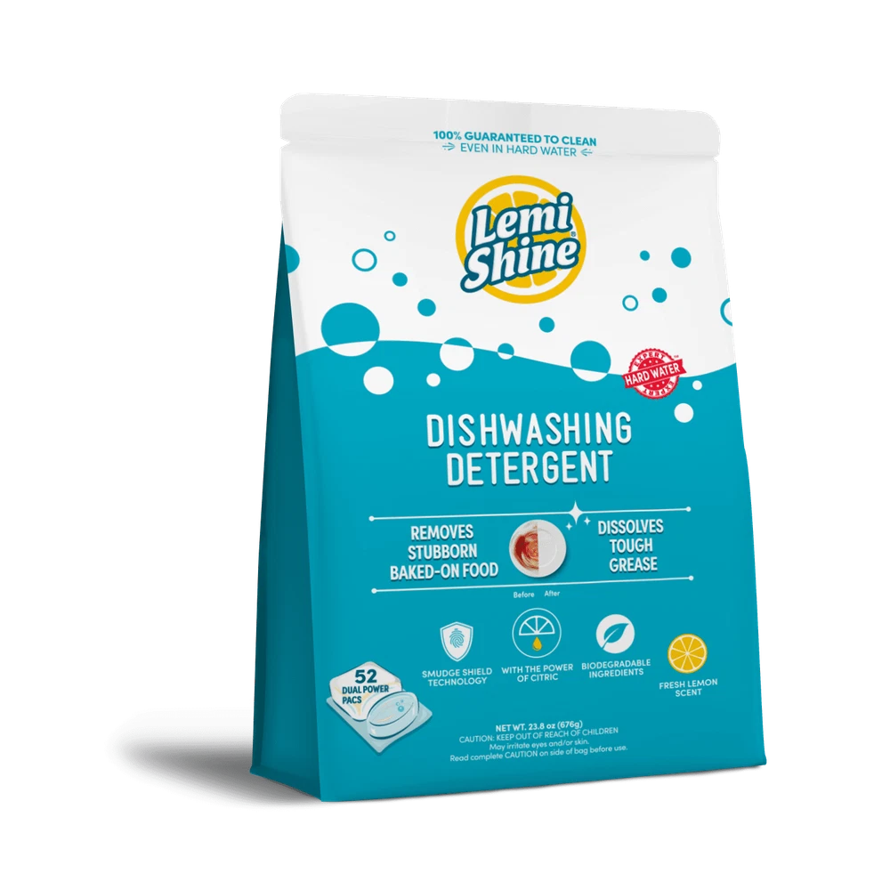 Lemi Shine Automatic Dishwasher Detergent Pods with Fresh Lemon Scent. Skip the pre-wash and take your dirty dishes straight from the table to the dishwasher. Sit back, relax and let Lemi Shine do all the dirty work! Lemi Shine Dishwashing Detergent cleans using natural citric acid that doesn’t leave a nasty residue on your dishes. Lemi Shine cuts through tough grease, stubborn stuck-on food (cleans even after 48 hours), tea and coffee stains, and hard water to make your dishes sparkling clean. Lipstick stains on your favorite glassware? Burnt and caked-on food on bakeware? Our dishwasher detergent liquid and powder combo cleans those too! Lemi Shine brilliantly washes your dishes and keeps glassware spotless and sparkling. Our dishwasher detergent is also sippy cup safe and is chlorine-free, phosphate-free, and made with biodegradable ingredients. Lemi Shine Automatic Dishwasher Detergent Pods, with Fresh Lemon Scent, 52 Ct Rinses away residue Spotless glassware No pre-wash needed Sparkling shine Biodegradable ingredients. No artificial fillers. Septic system friendly Cleans hard water stains Cuts through grease Removes 48-hour stuck-on food Provides etch protection Cleans with natural citric acid Certified EPA Design for the Environment. Safe around people and pets On Oct 30, 2024 at 02:48:18 PDT, seller added the following information: