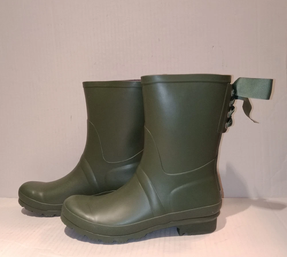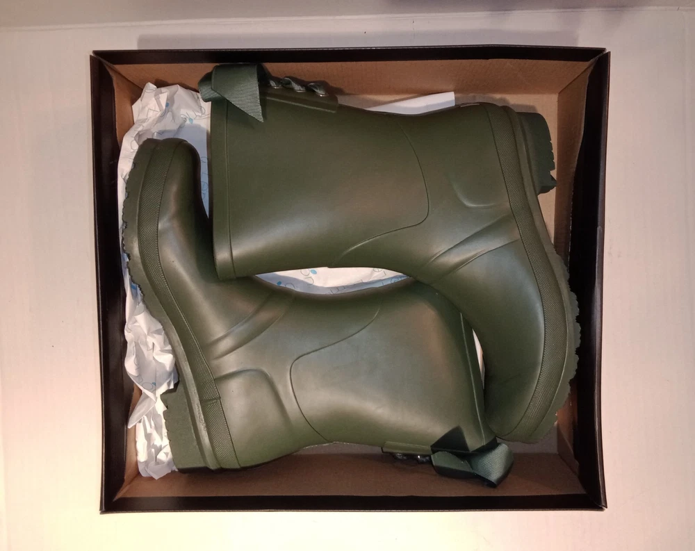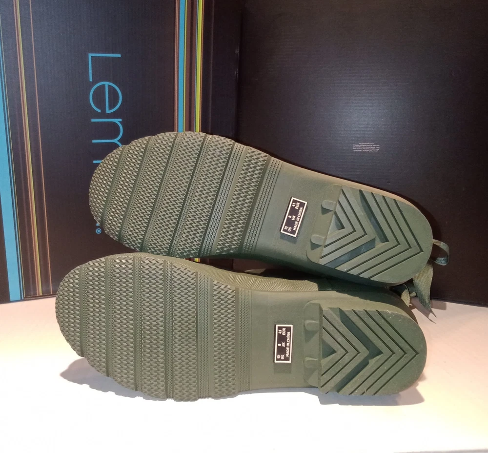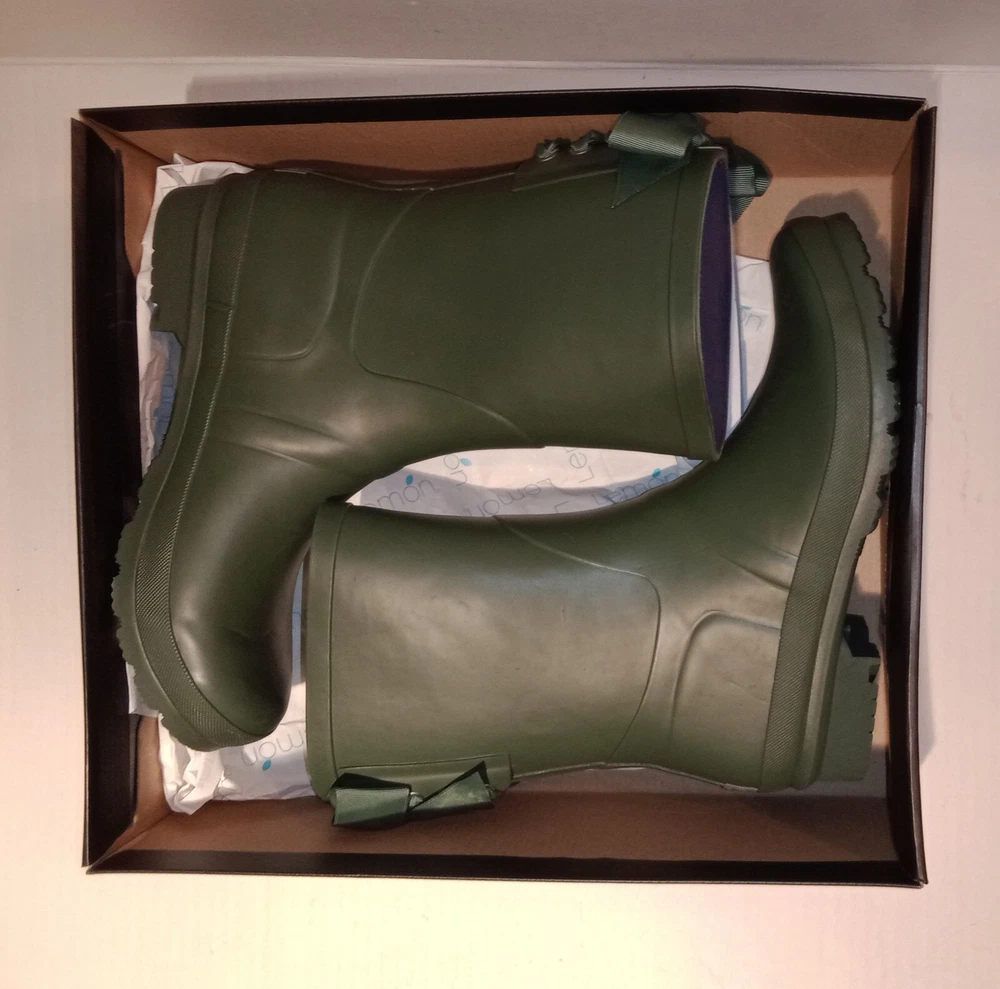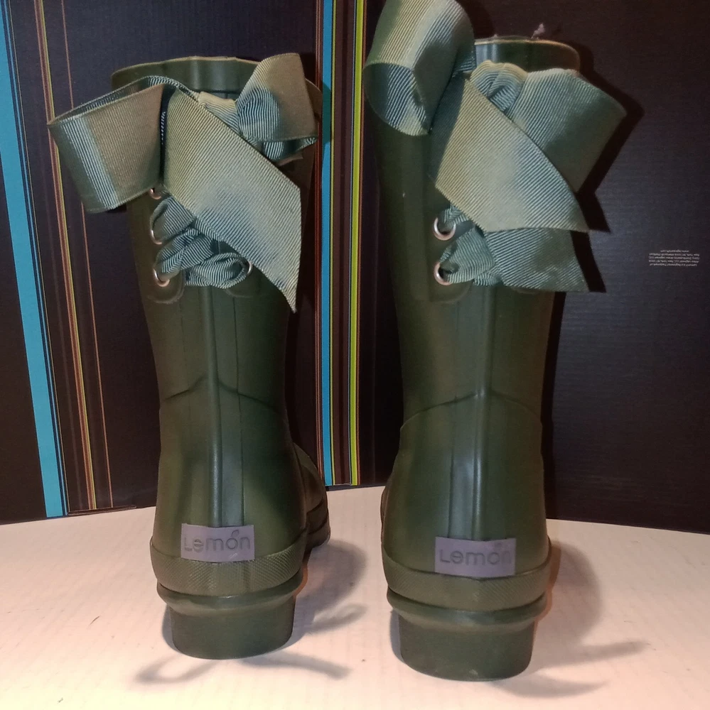 Lemon Lace-Up Rubber Rain Boots, LMBRT-3607, Duck Green Women's Size 10 $99 NIB. Stylish fisherman design with a feminine gros grain ribbon lace-up in the back. Utilitarian. Pull-On construction. The ribbon is only decorative. They don't open at the back. Excellent condition, never worn, just stored in the box with no major flaws, damage, etc noted. Zoom in. See pics. Smoke free,pet free household.... Please see my other quality items including designer handbags, designer shoes, designer, vintage, semi-precious jewelry, Swiss watches, apparel, and home goods, etc. Thanks for looking.