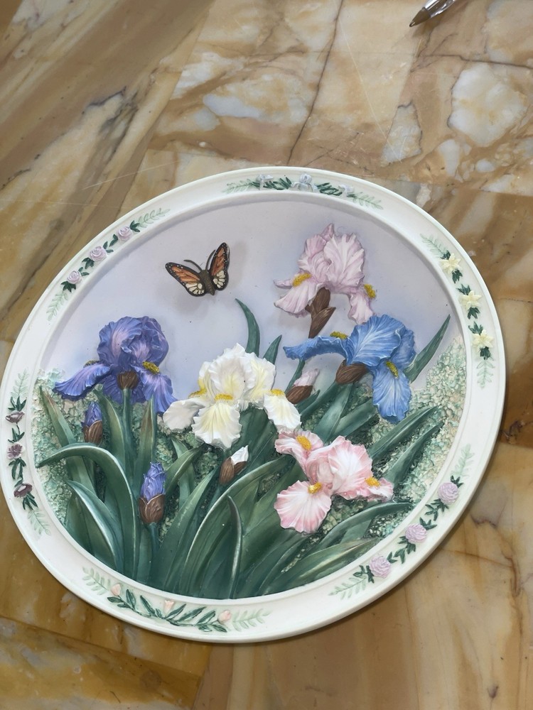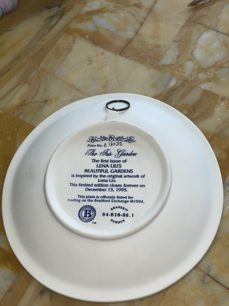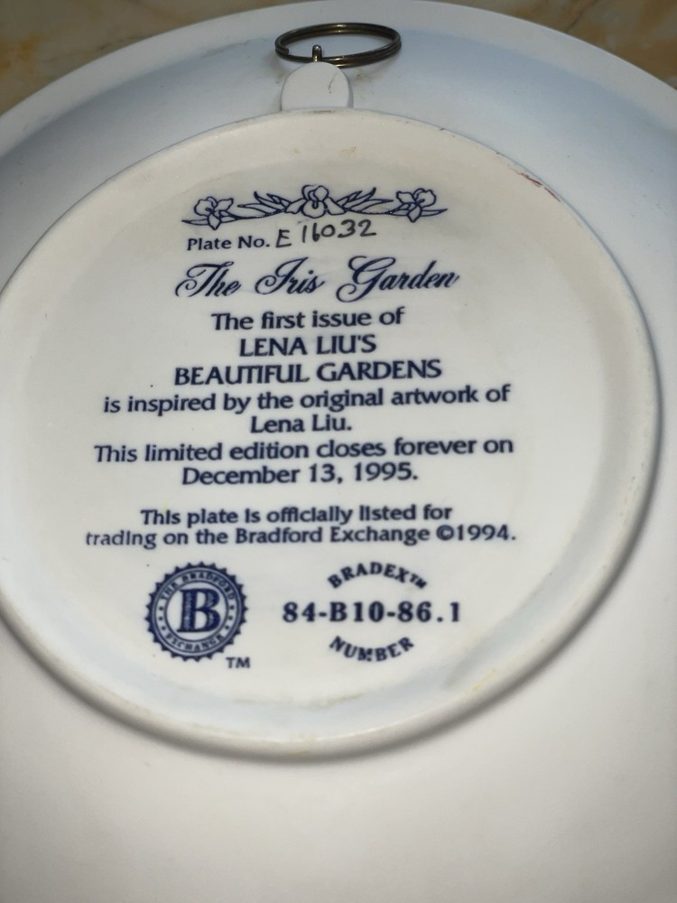 Lena Liu's Beautiful Garden "The Iris Garden" Bradford Exchange 3D Plate E16032 is a vintage ceramic collector plate featuring a decorative style with multicolor 3D flowers and butterflies. Produced in the late 20th century, this art pottery piece showcases American culture and craftsmanship. With a 7-inch diameter, this collector's item is perfect for all occasions, adding a touch of beauty and charm to any home decor. The Bradford Exchange brand ensures quality and uniqueness in this exquisite collector's piece.
