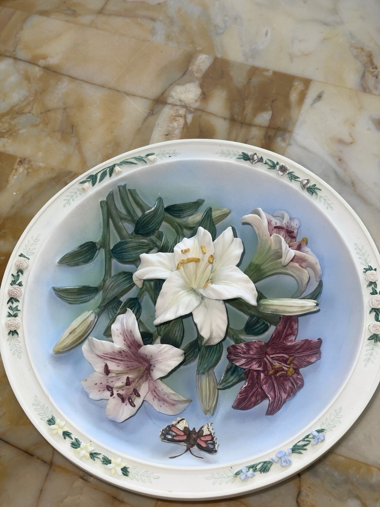 The Lily Garden Plate by Lena Liu is a beautifully crafted ceramic collector plate featuring a stunning design of 3D flowers and butterflies. This vintage piece from the Bradford Exchange is a decorative item perfect for any occasion, with a multicolor paint job that adds a touch of elegance. Measuring 7 inches in diameter, this late 20th-century sculpture reflects American culture and artistry from the 1990s era. Ideal for collectors of decorative pieces, this plate showcases the intricate craftsmanship and unique style that Lena Liu is known for.