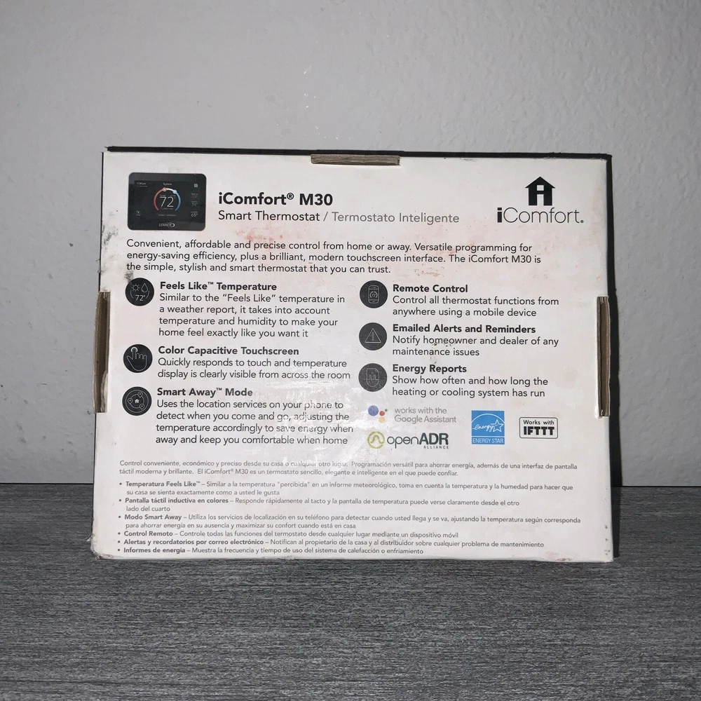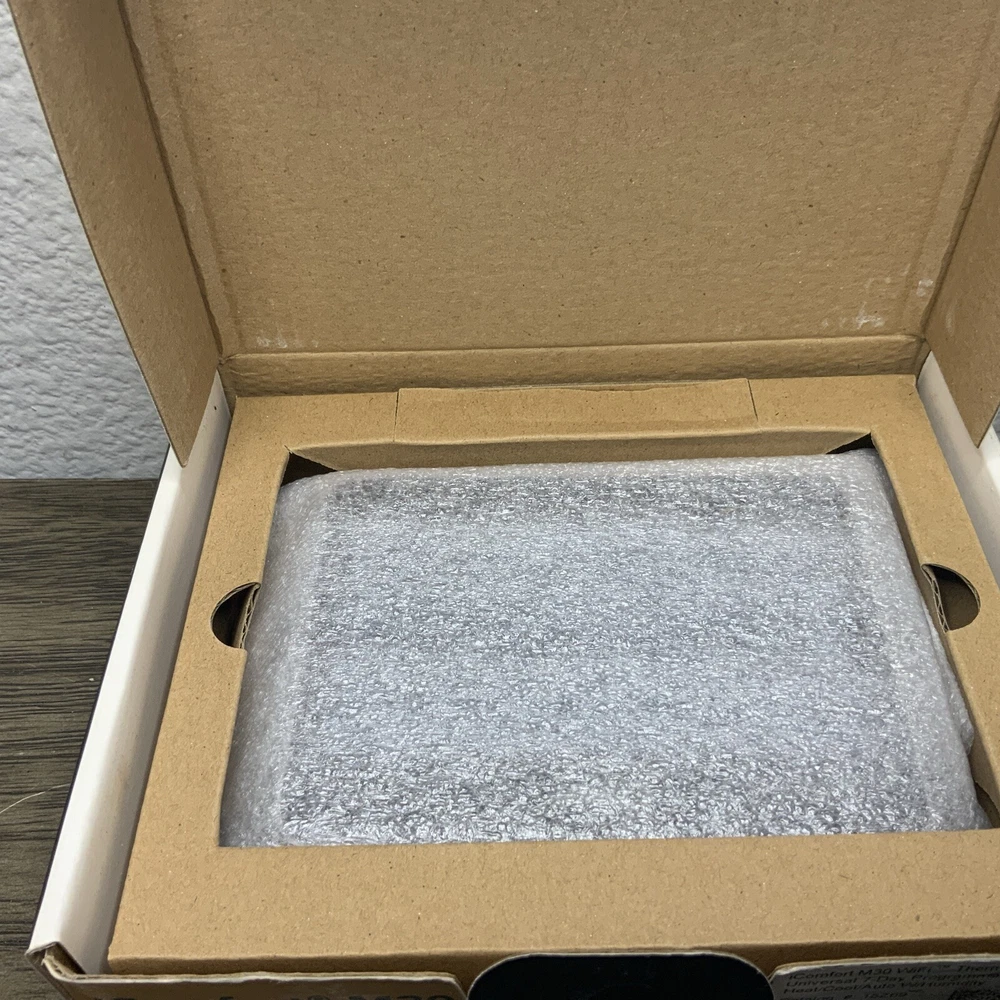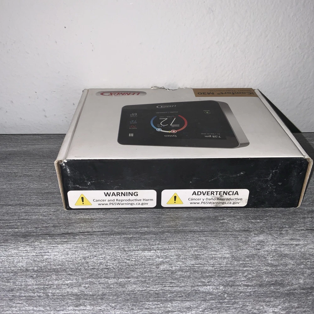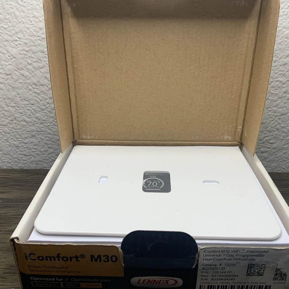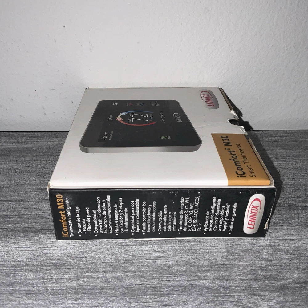 New Thermostat in Box, boxes do have wear however thermostats are new and never installed. Multiple Quantity Listing so box may not match picture as far as wear. Thermostats are new and never installed. Enhance your home's heating, cooling, and air system with the Lennox iComfort M30 Universal Smart Thermostat. With a 4.3-inch color display and app control, this programmable thermostat is easy to use and monitor. It is compatible with HVAC systems and has a low voltage of 24 V. The Lennox iComfort M30 Universal Smart Thermostat has temperature sensor technology and programmable features that allow you to set different heat and cool stages for 7 periods a day. It is wall-mounted and has a rectangular shape in black plastic material. This thermostat is also compatible with universal, Apple HomeKit, and Amazon Alexa smart home protocols. Upgrade your home's climate control system with the Lennox iComfort M30 Universal Smart Thermostat.