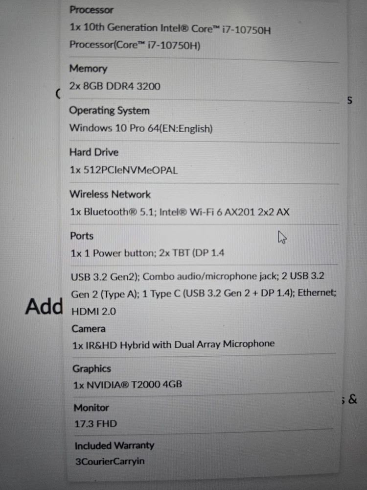 MODEL: 20SN0041US PRICE $1400 OBO This 17.3" Lenovo Thinkpad P17 Gen1 Mobile Workstation is in fully working order ready to be used. IT DOES SHOW A LINE ACROSS THE SCREEN BUT IT'S VERY THI AND CAN BE USED LIKE THAT. AFTERMARKET CHARGER SPECS 10th Gen Intel i-7 10750H processor 64GB RAM TWO SDD OF 512GB EACH BLUETOOTH 5.1 NVIDIA T2000 4GB GRAPHICS WINDOWS 10 PRO FRESH INSTALL