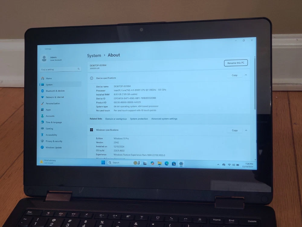 Lenovo ThinkPad Yoga11e-G6 Touch- X360 Intel Core m3-8100Y CPU 1.1 to 1.61 GHz 8GB RAM 256GB SSD Win 11 Pro Resolution: 1368 x 736 Professionally cleaned and tested. It is fully functional and comes with a charger. It is used so it may have some cosmetic wears, but it is in a good condition Return is not accepted.