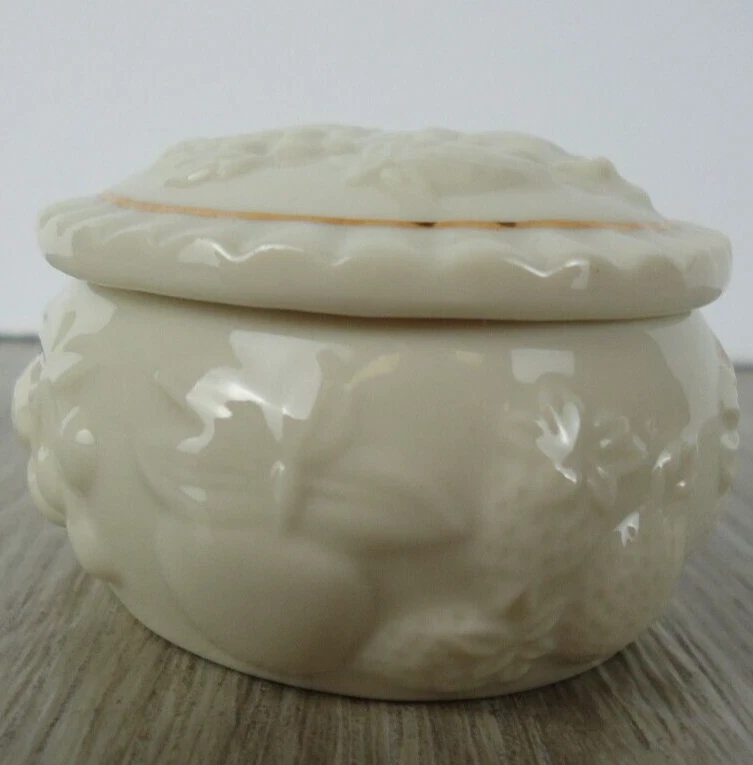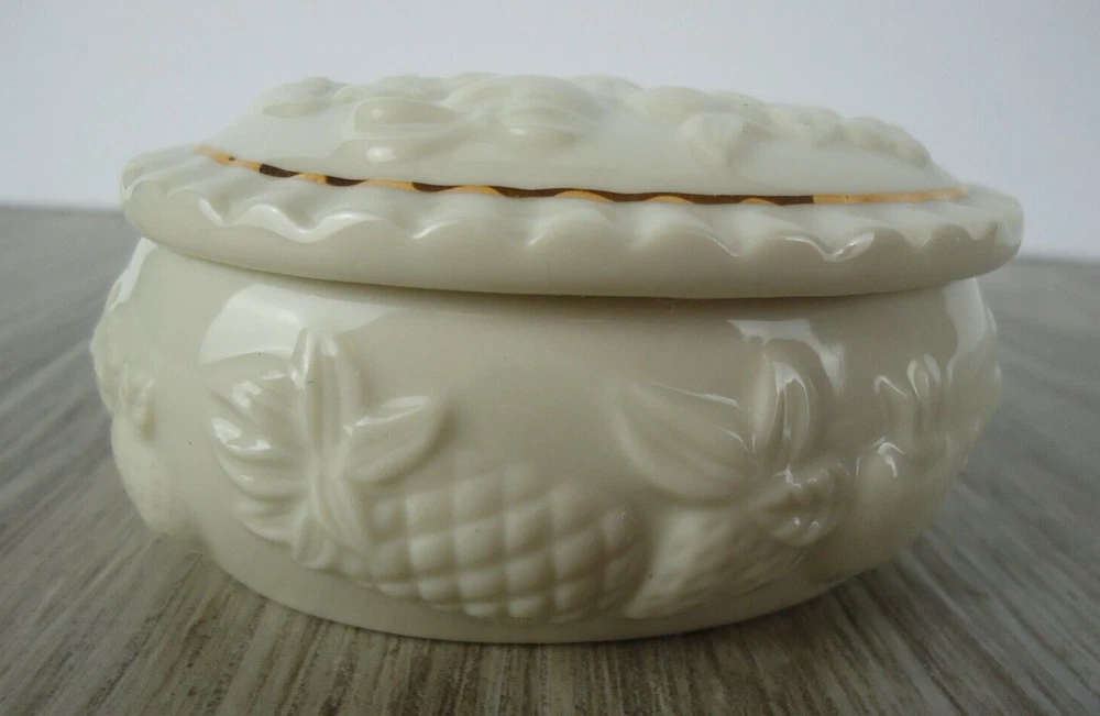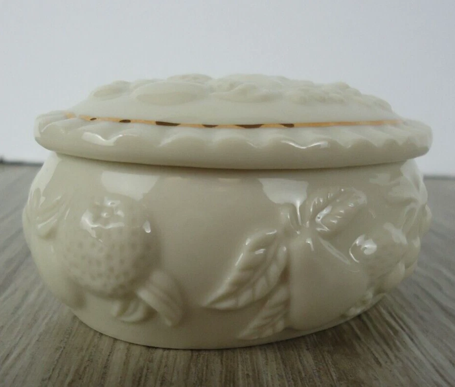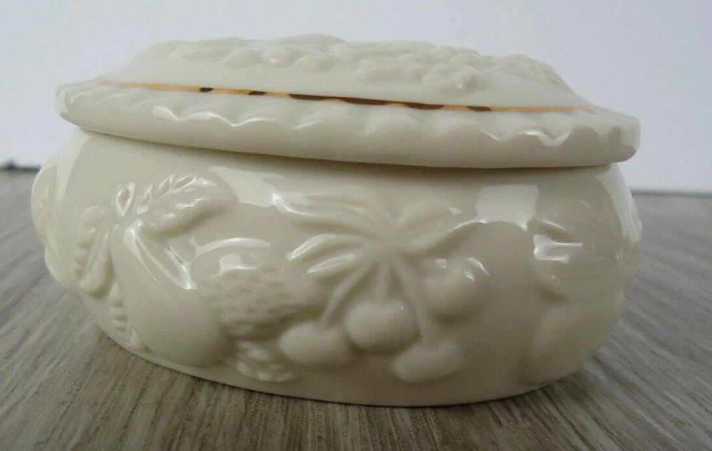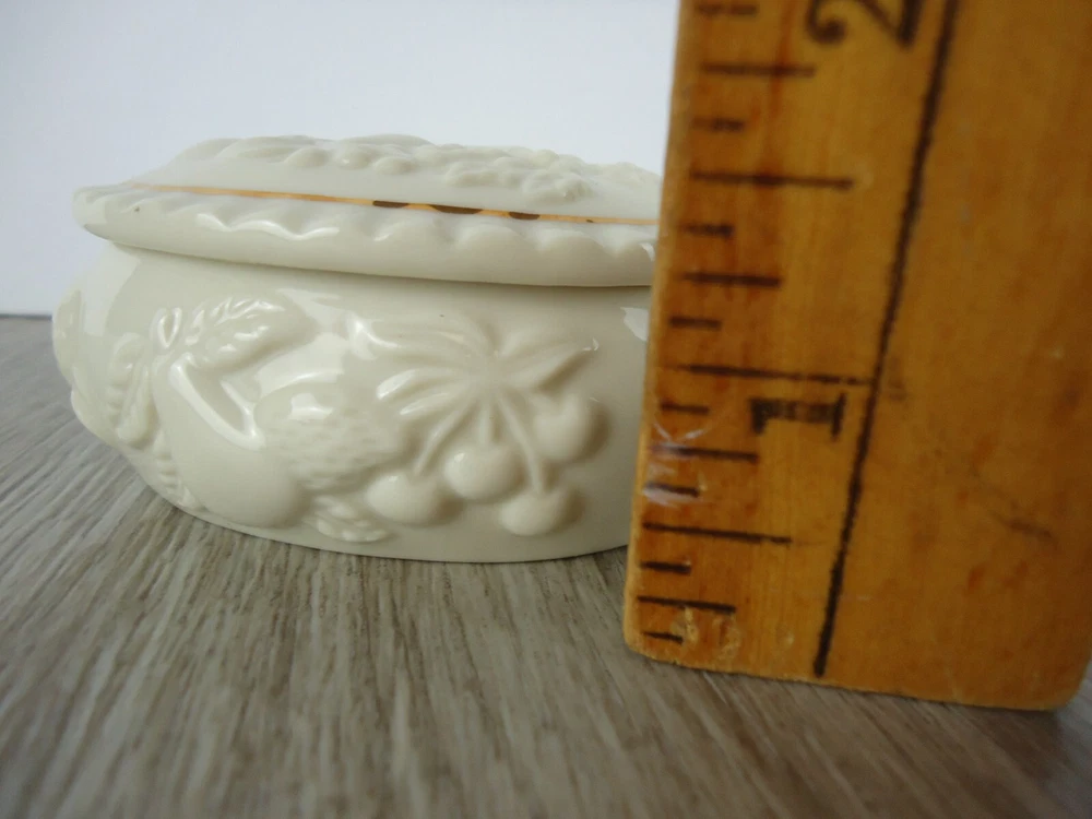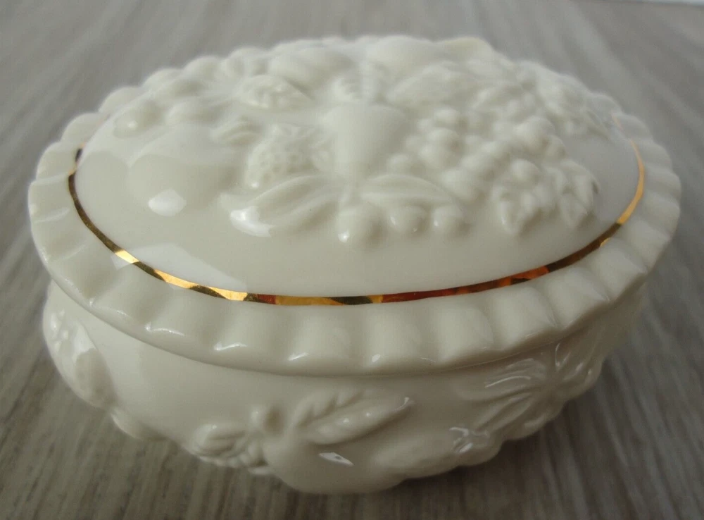 Shape:OvalSubject:Fruit Pineapple Strawberry Cherries GrapesPackaging:BoxFeatures:With Lid, Gold Detail, HandcraftedSeller Notes:“Preowned used condition.”Style:Maximalist Spring garden French CountryCountry/Region of Manufacture:ChinaYear Manufactured:1989Occasion:All OccasionsPattern:All-OverColor:WhiteBrand:LenoxTheme:Fairy Tales, Food & Drink, NoveltyMaterial:PorcelainType:Trinket BoxCollection:Fruit of Life