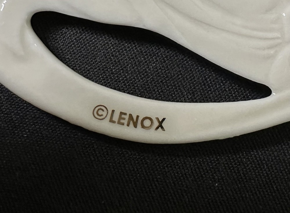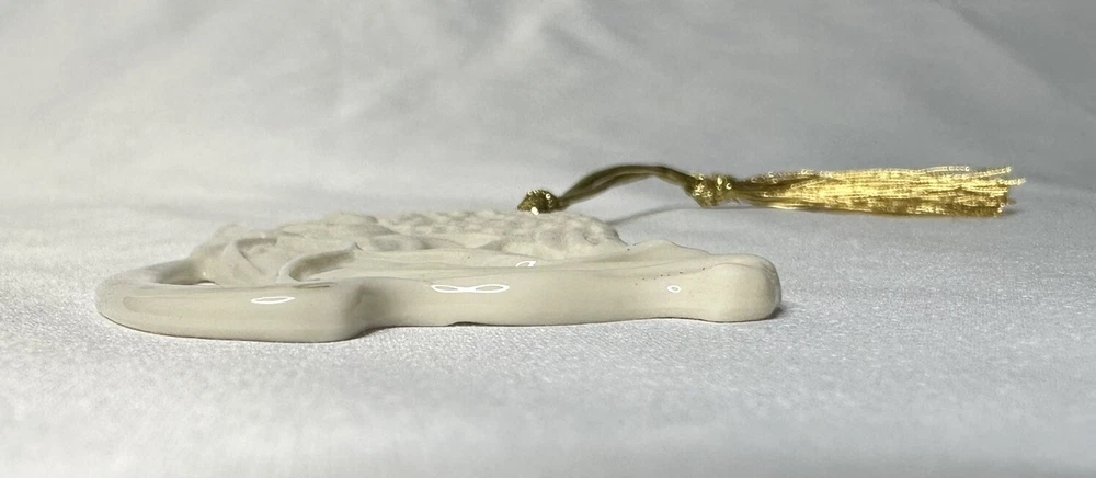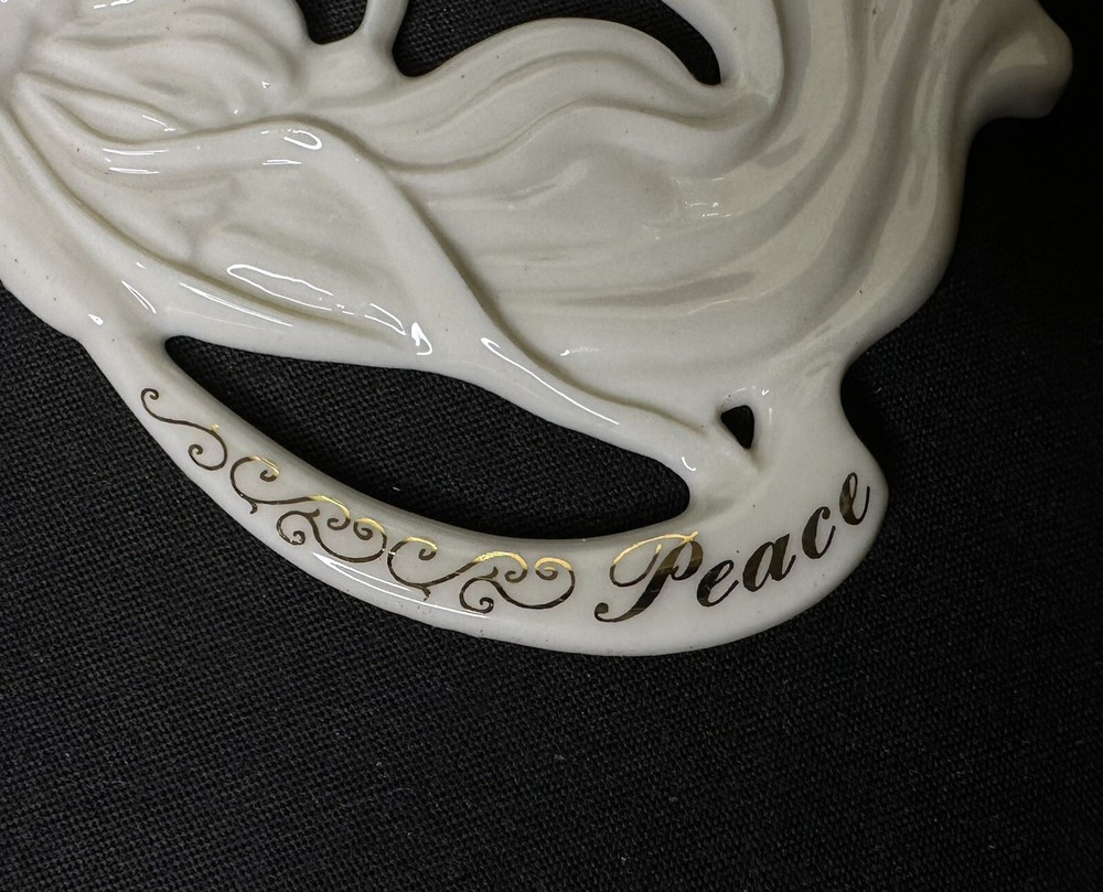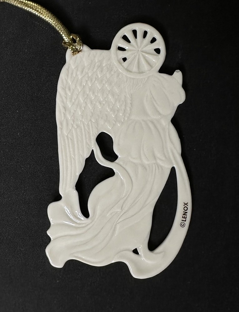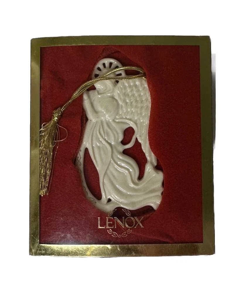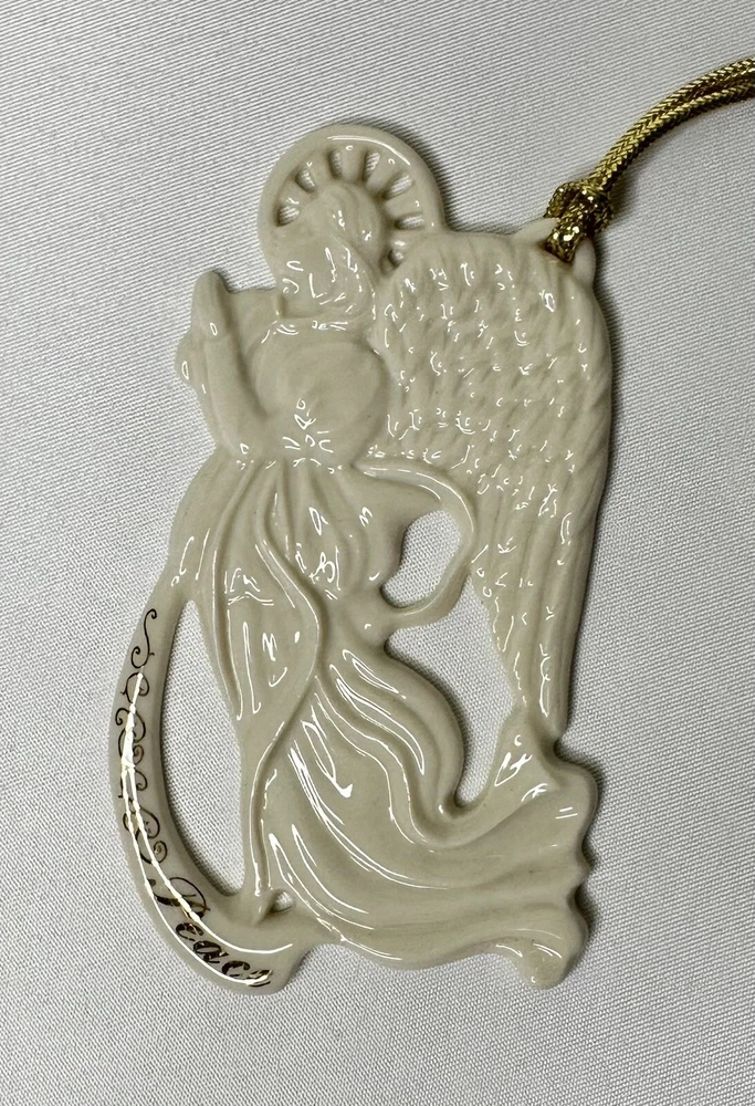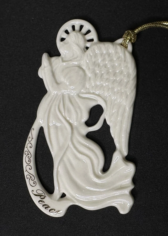 Lenox Angel of Peace Ornament with Box. Approximately 3 5/8” by 2 1/8” wide. Condition is Used. Please note imperfection on the angel’s backside hand (appears glazed over). Original Box Condition: The felt on the box has separated from the foam and material is flaking (small red particles).