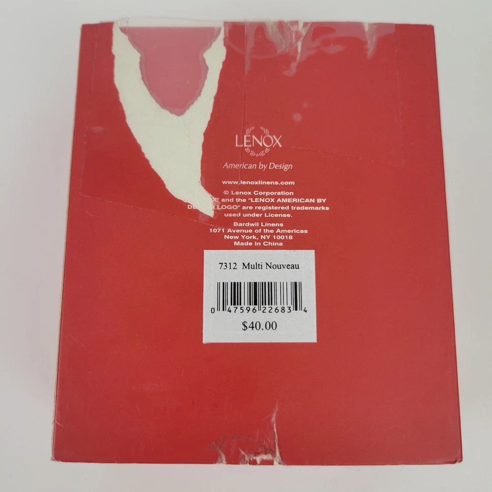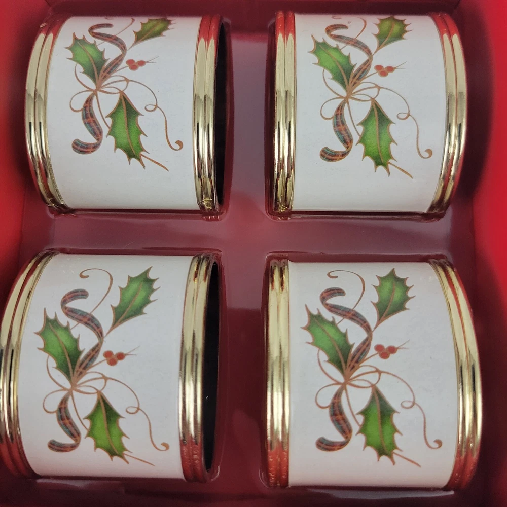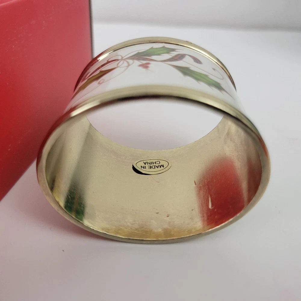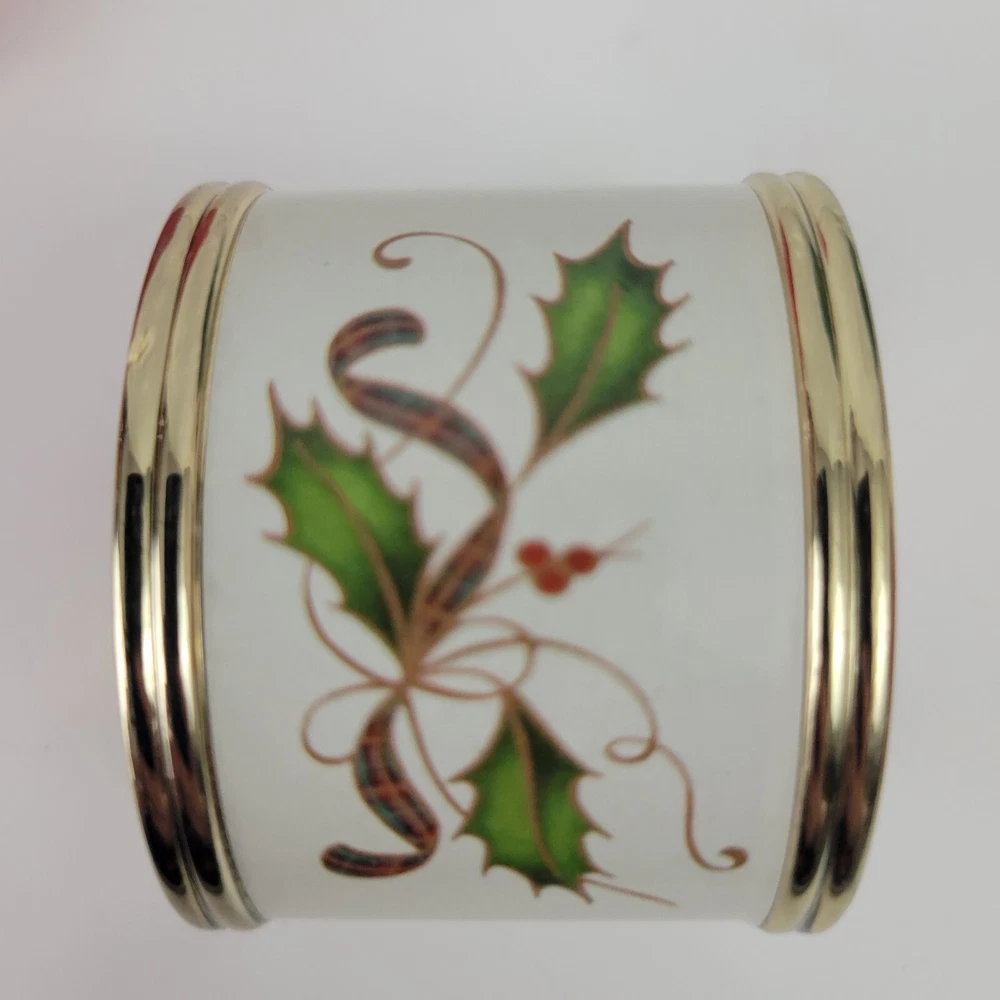This is a nice set of Lenox (American by Design) Napkin rings featuring Holly, berries, and ribbon on a solid Oval napkin ring. The napkin rings measure 1 5/8" wide, 1 5/8" tall, and 2" long. The box has some damage, especially to the back so please take a look at all the pictures for details.