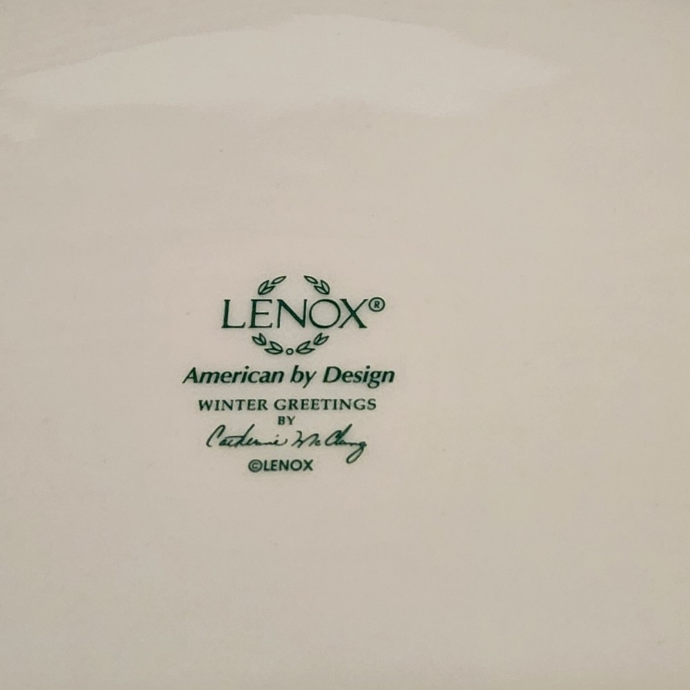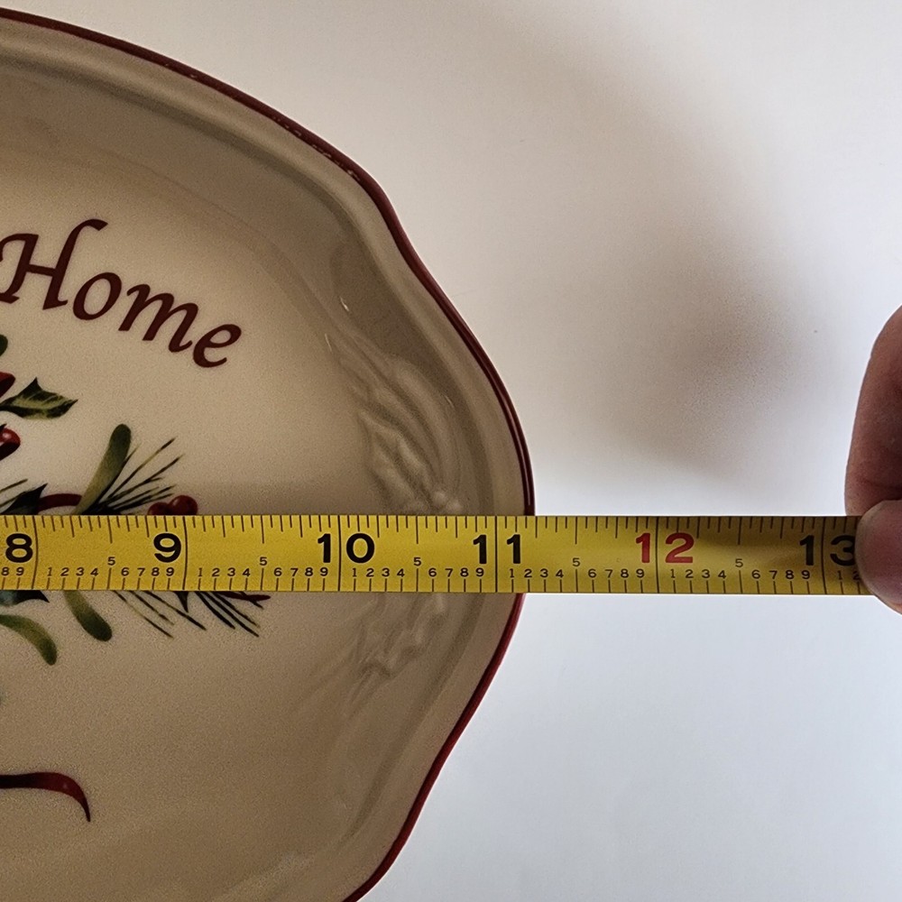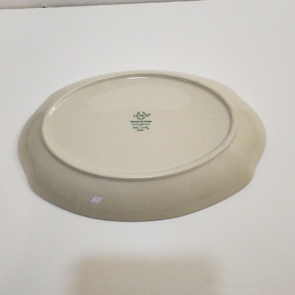 The Lenox American Winter Greetings "Bless This Home" 11-inch Oval Platter is made of porcelain and features a Beige color with a glossy finish. It has a Holiday Cardinals theme and a printed backstamp. This platter is part of the Winter Greetings product line by Lenox and is dishwasher safe. Measuring 11 inches in length, 7.25 inches in width, and 1.25 inches in height, this oval platter has one compartment and weighs 2 lbs. It is a charming piece for serving and displaying during the winter season. Lenox American by Design Winter Greetings, Bless This Home 11” platter with a beautiful red cardinal sitting among a holly, pine cone and ribbon background. Red trim has minor wear as indicated in photos. Beautiful accent piece for serving appetizers, decorating, or gift giving.